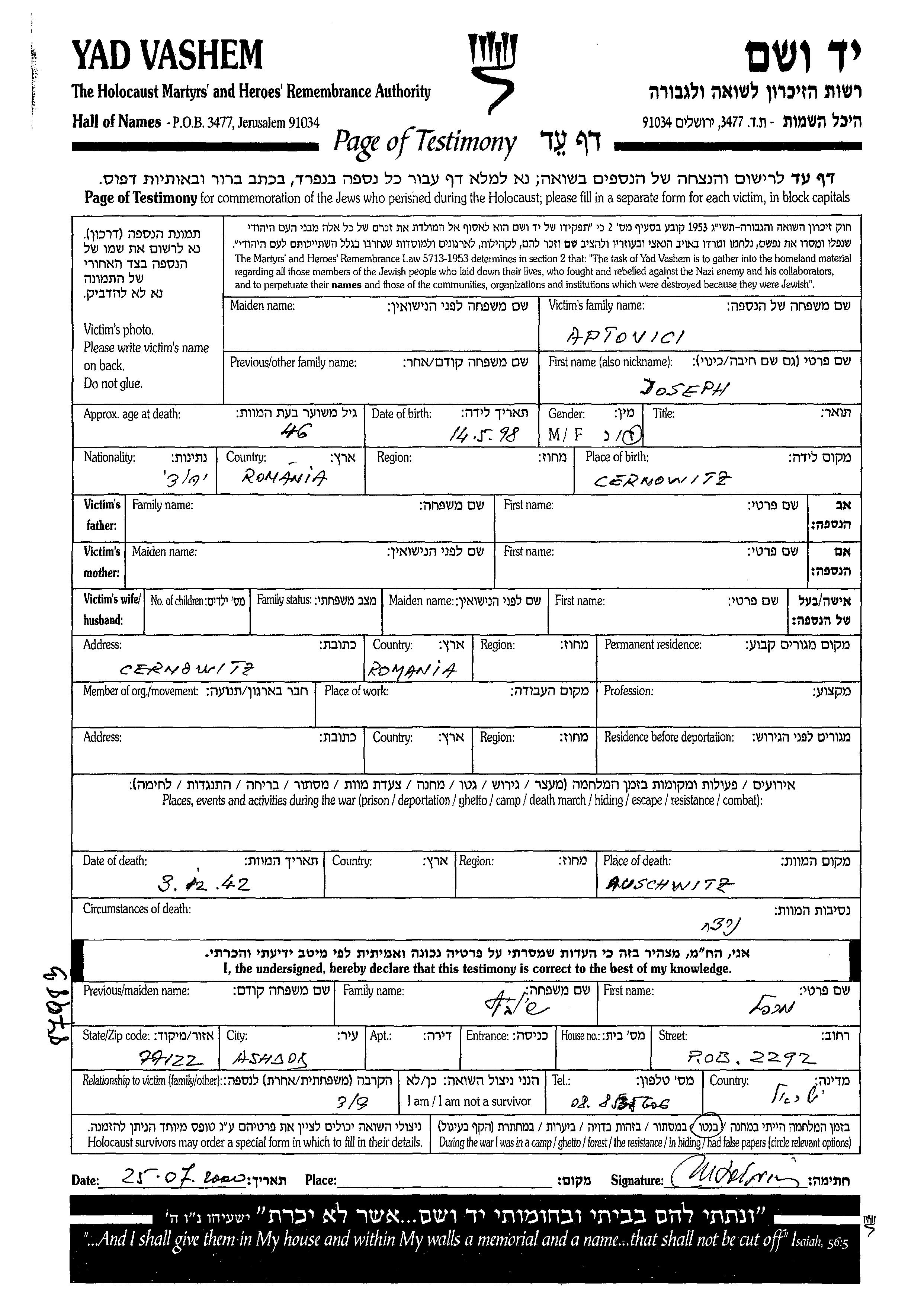 | Aptowitcz | Ioseph | Czernowitz, Romania | Page of Testimony | |