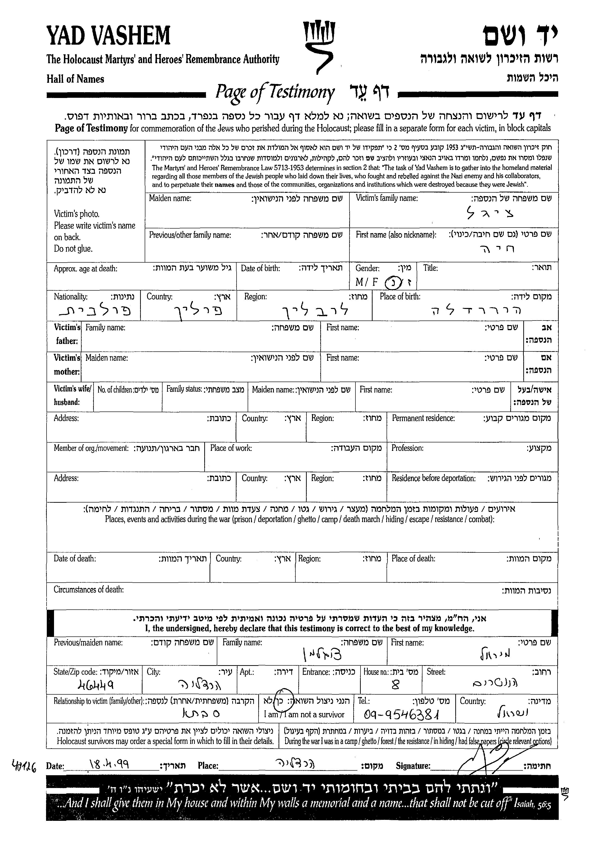 Tzigel Khaia unstated place, Page of Testimony