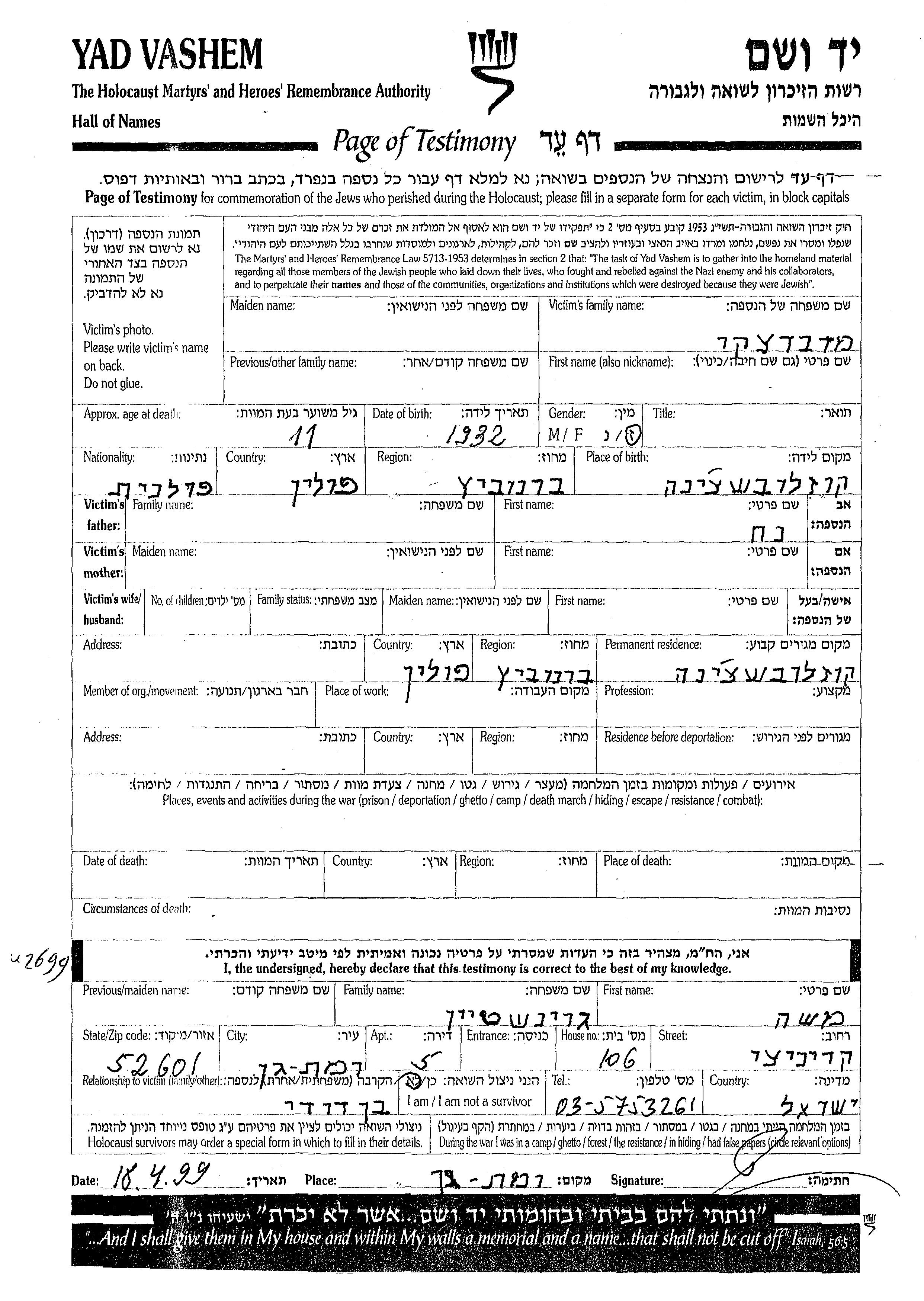 Medvedetzki First name unknown 1932 Koslowszczyna, Poland Page of Testimony