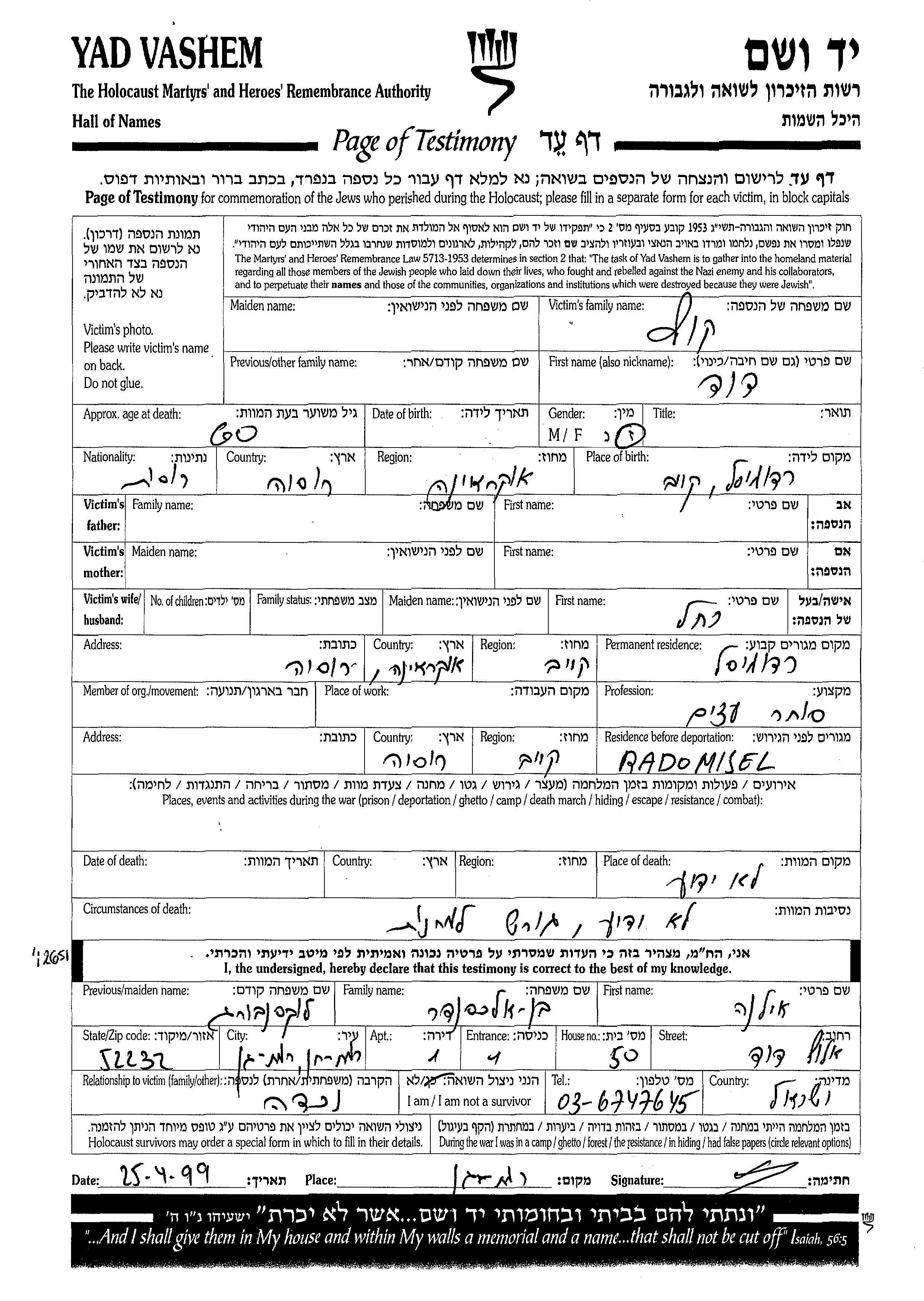 Yad Vashem - Pages of Testimony Names Memorial Collection