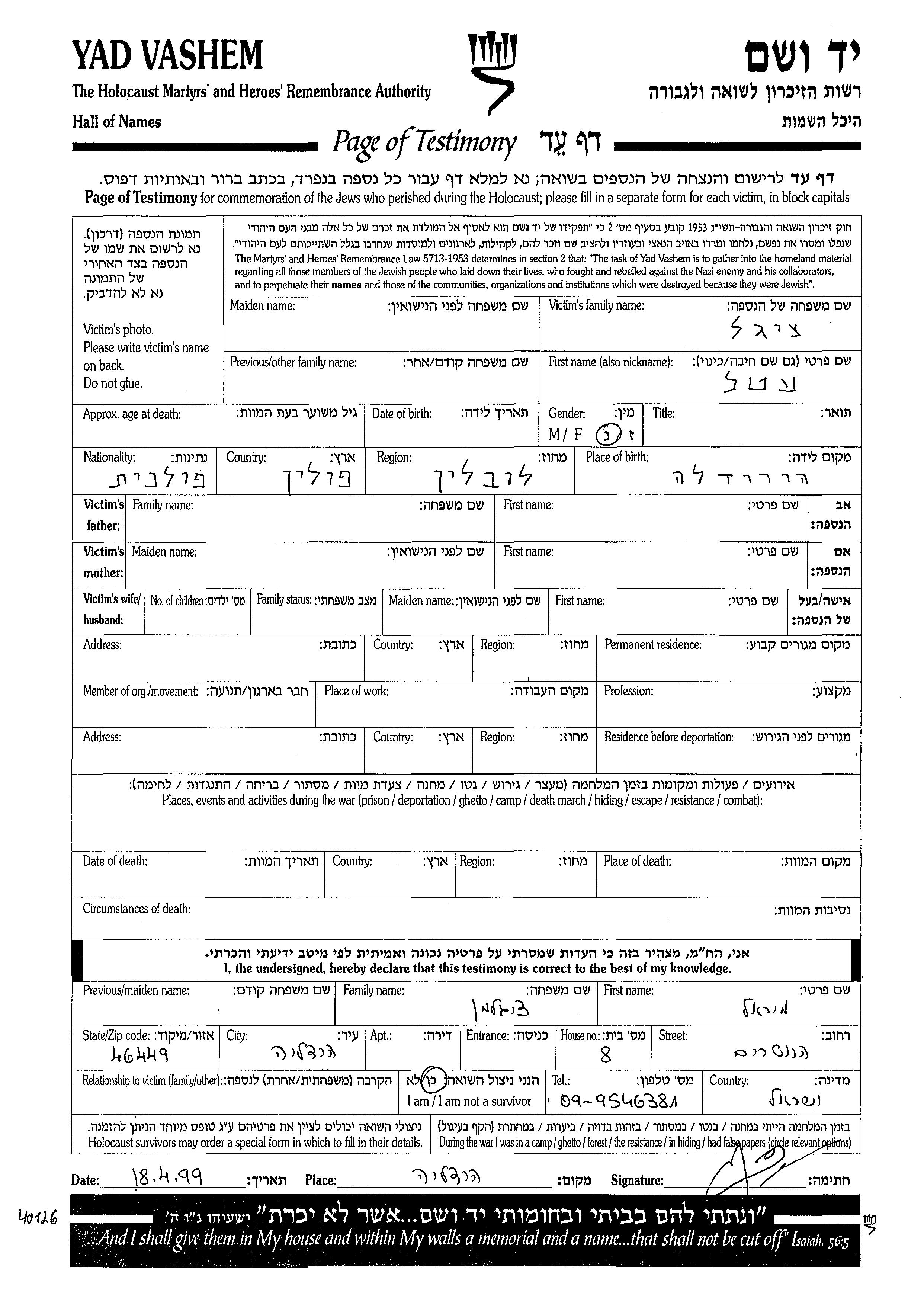 Yad Vashem - Pages of Testimony Names Memorial Collection