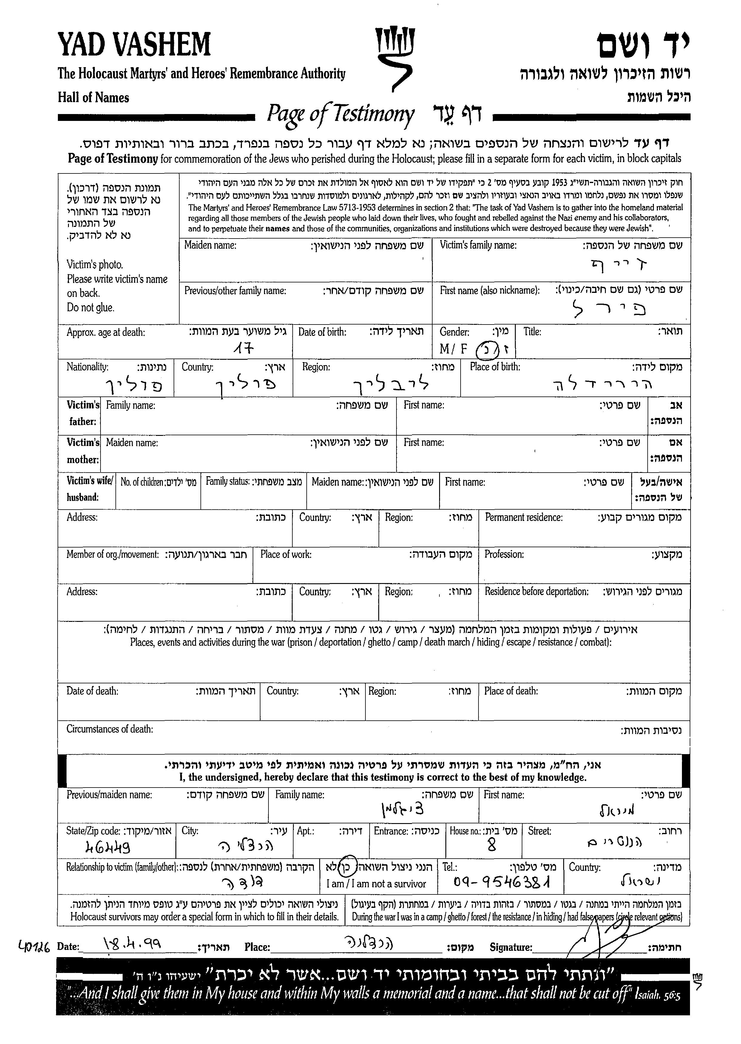 Zeif Pirel unstated place, Page of Testimony
