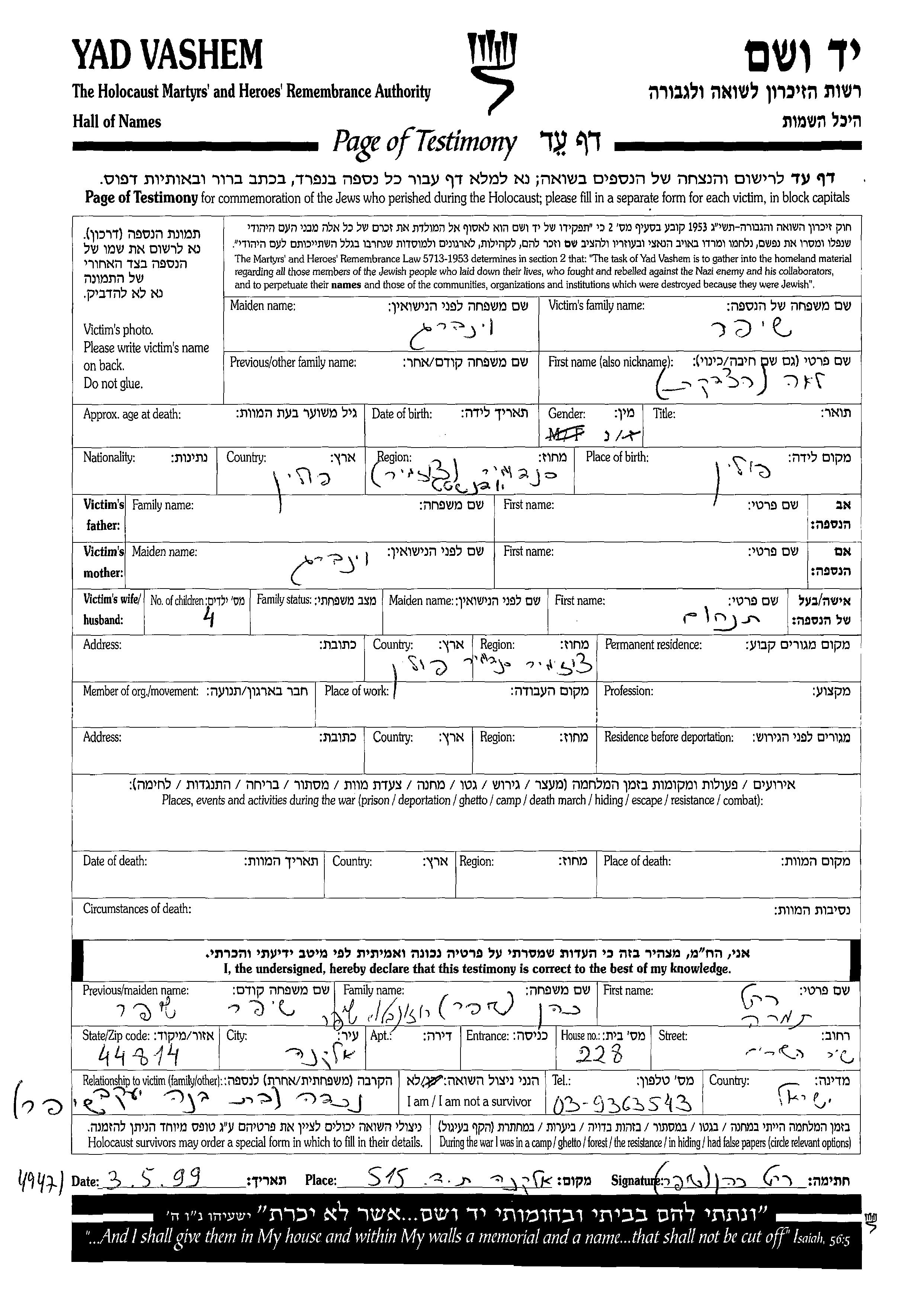 Yad Vashem - Pages of Testimony Names Memorial Collection