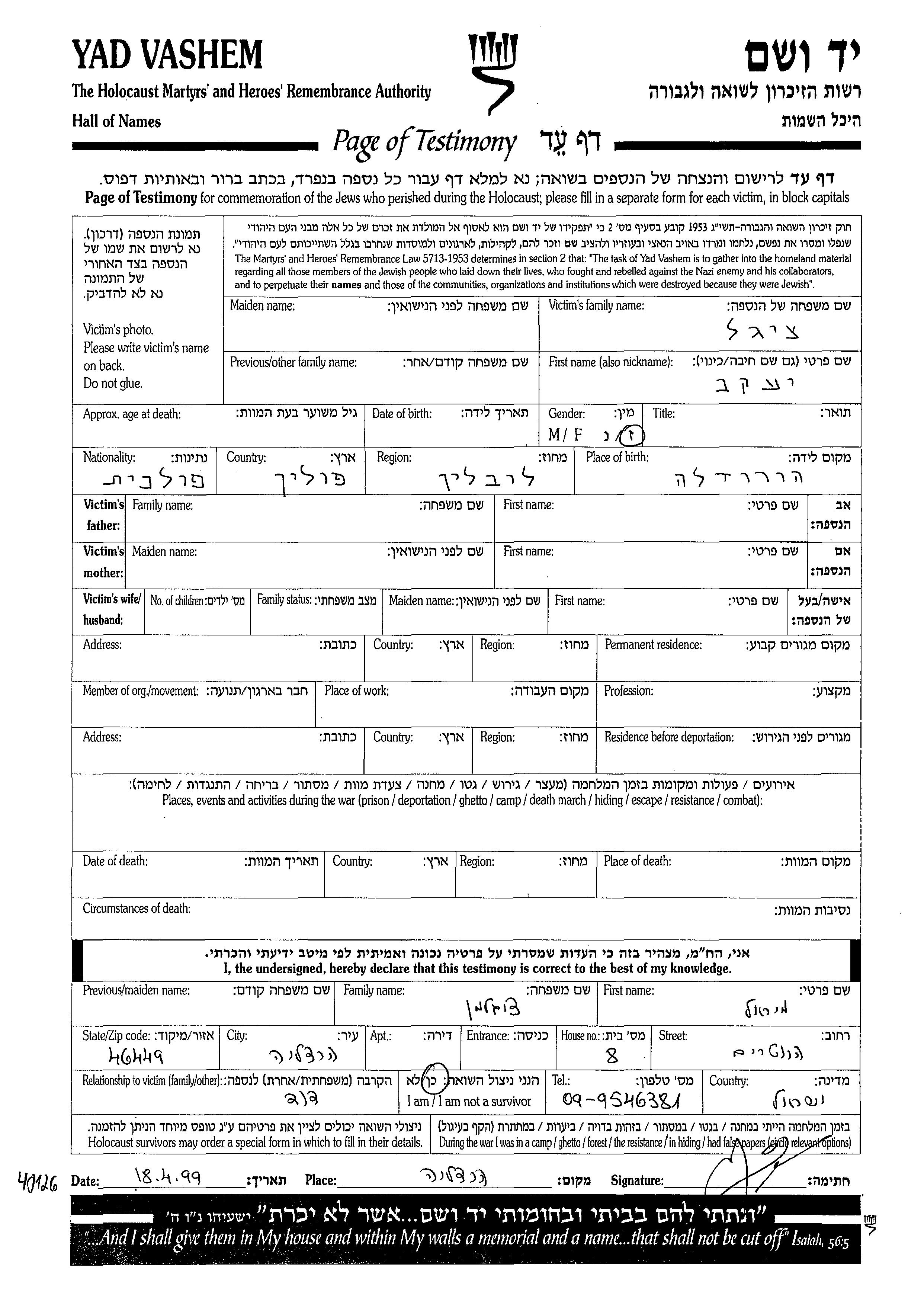 Yad Vashem - Pages of Testimony Names Memorial Collection