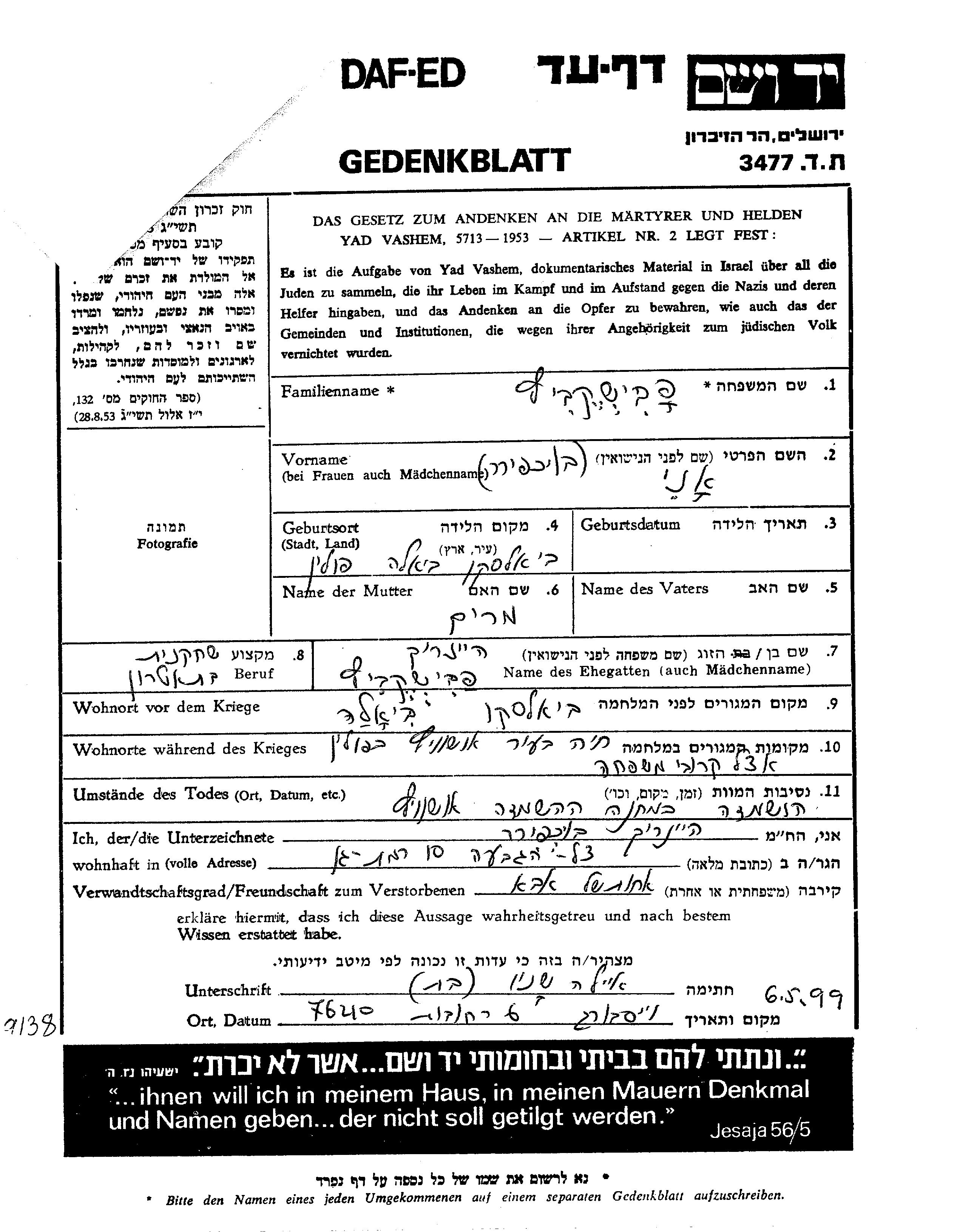 Ani Fabishkevitz nee Bukhfirer was born in Bielsko Biala, Poland to Miriam. She was a theatre actress and married to Heinrikh. Prior to WWII she lived in Bielsko Biala, Poland. During the war she was in Auschwitz, Poland. Ani was murdered in the Shoah. Place of death: Auschwitz, Poland.