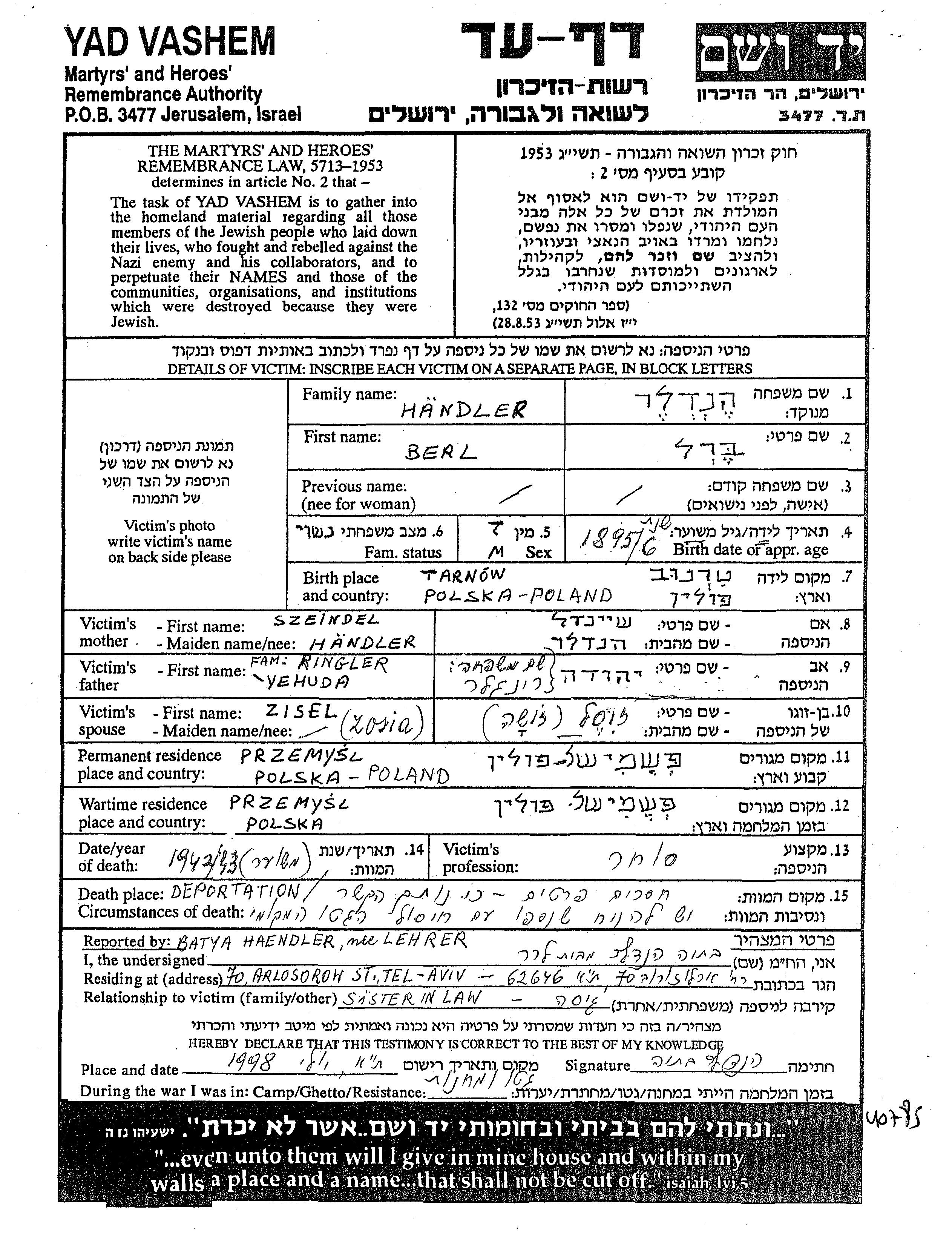Hendler Berl 1895 Przemysl, Poland Page of Testimony