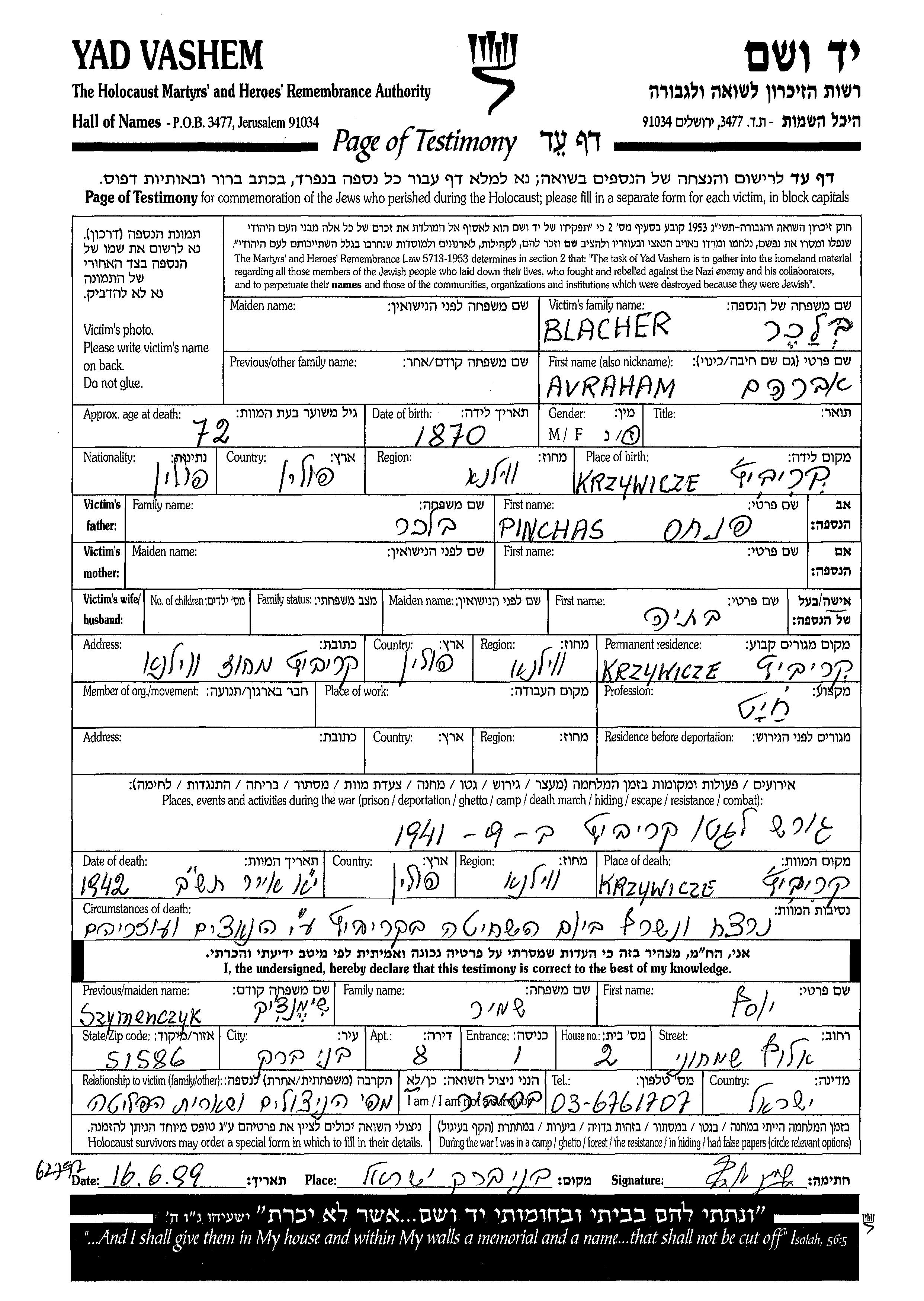 Avraham Blacher was born in Krzywicze, Poland, 1870. He was a tailor. Prior to WWII he lived in Krzywicze, Poland. Avraham was murdered in the Shoah. Place of death: Krzywicze, Poland, 11/04/1942.