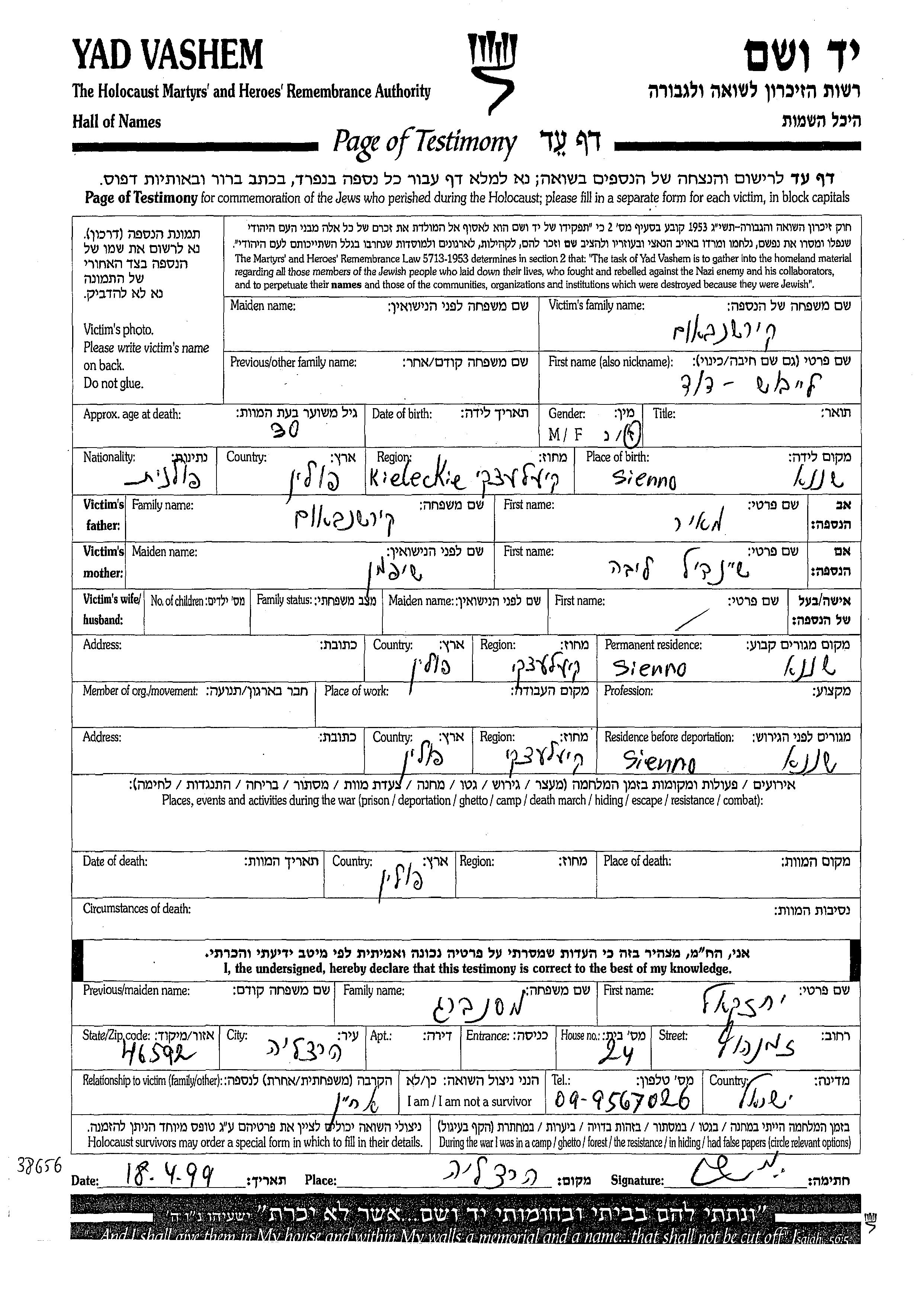 Leibush David Kirshenbaum was born in Sienno, Poland to Meir and Sheindil Liba. Prior to WWII he lived in Sienno, Poland. During the war he was in Sienno, Poland. Leibush David was murdered in the Shoah. Place of death: Poland.