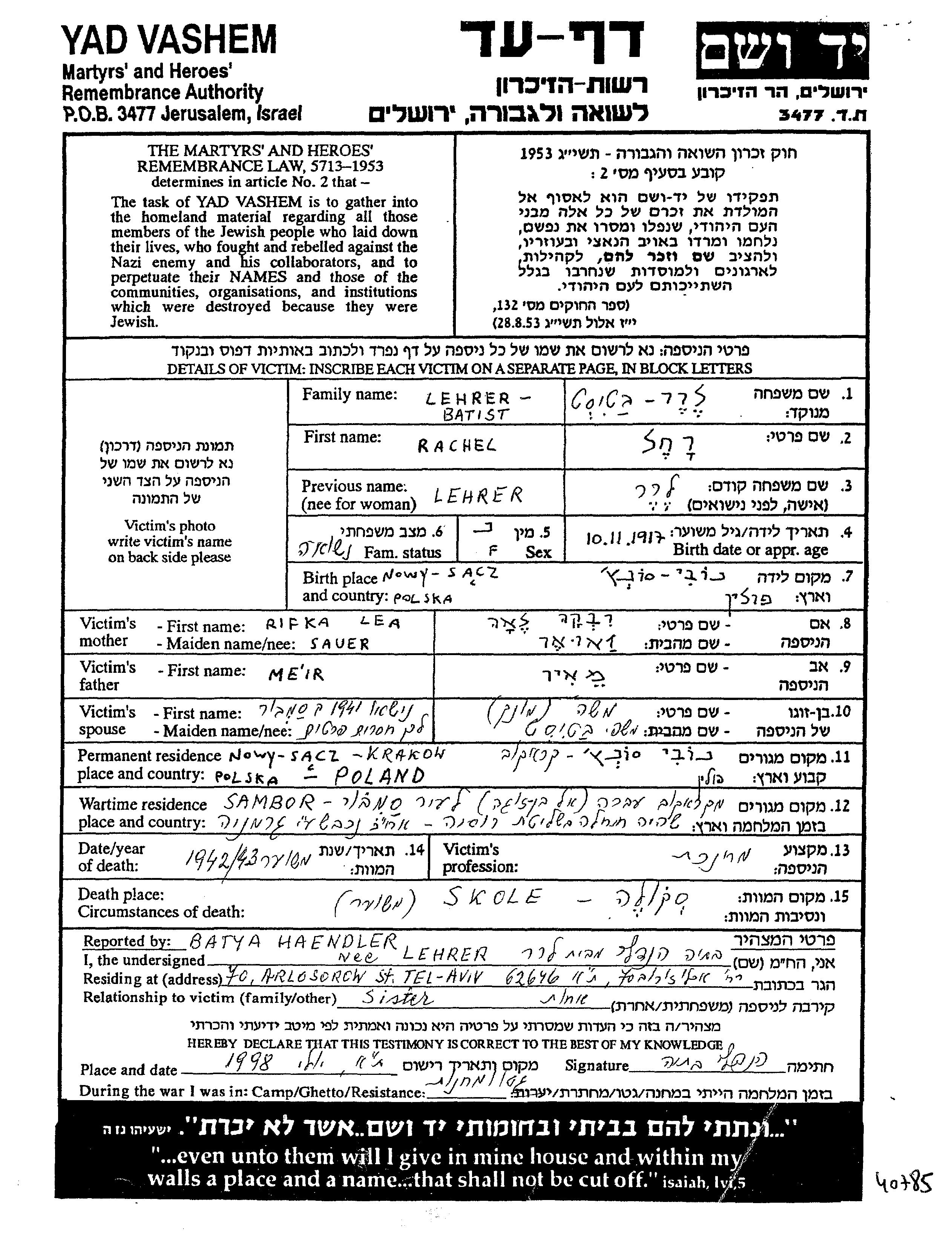 Batist Rachel 1917 Krakow, Poland Page of Testimony