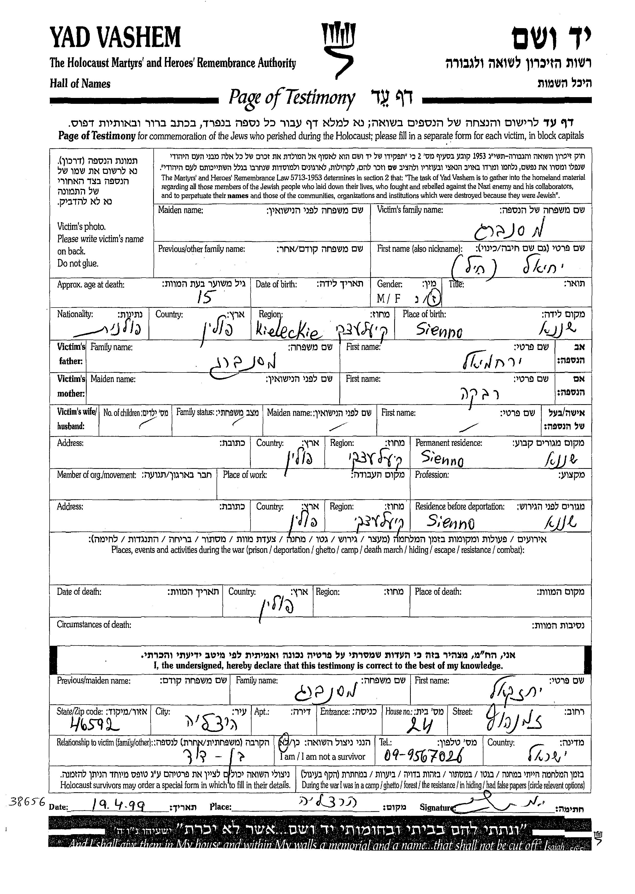 Yekhiel Mesenberg was born in Sienno, Poland to Yerakhmiel and Rivka. Prior to WWII he lived in Sienno, Poland. During the war he was in Sienno, Poland. Yekhiel was murdered in the Shoah. Place of death: Poland.