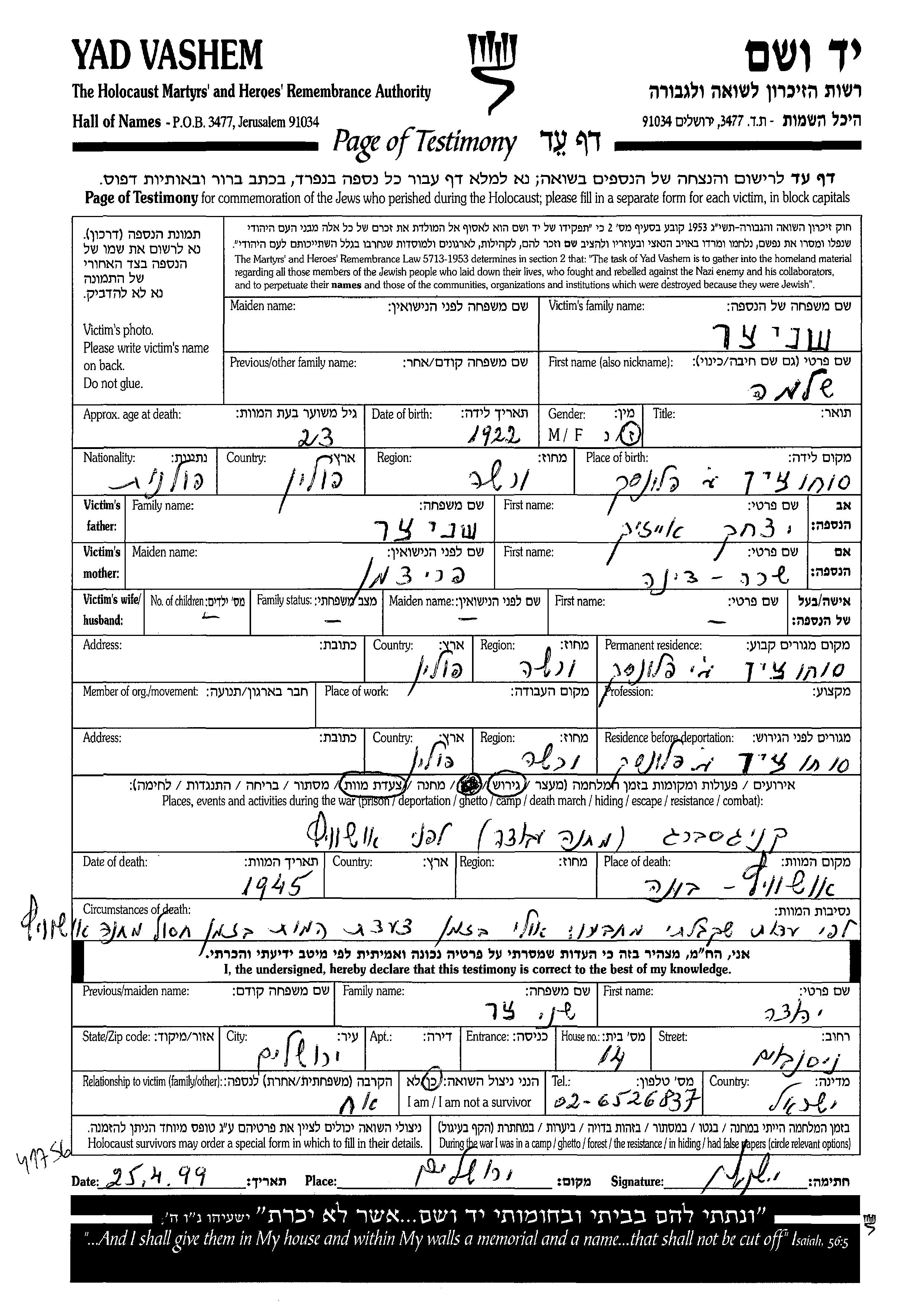 Shlomo Shnitzer was born in Sochocin, Poland, 1922 to Yitzkhak and Sara Dina. Prior to WWII he lived in Sochocin, Poland. During the war he was in Sochocin, Poland. Shlomo was murdered in the Shoah. Place of death: Auschwitz, Poland, 1945.