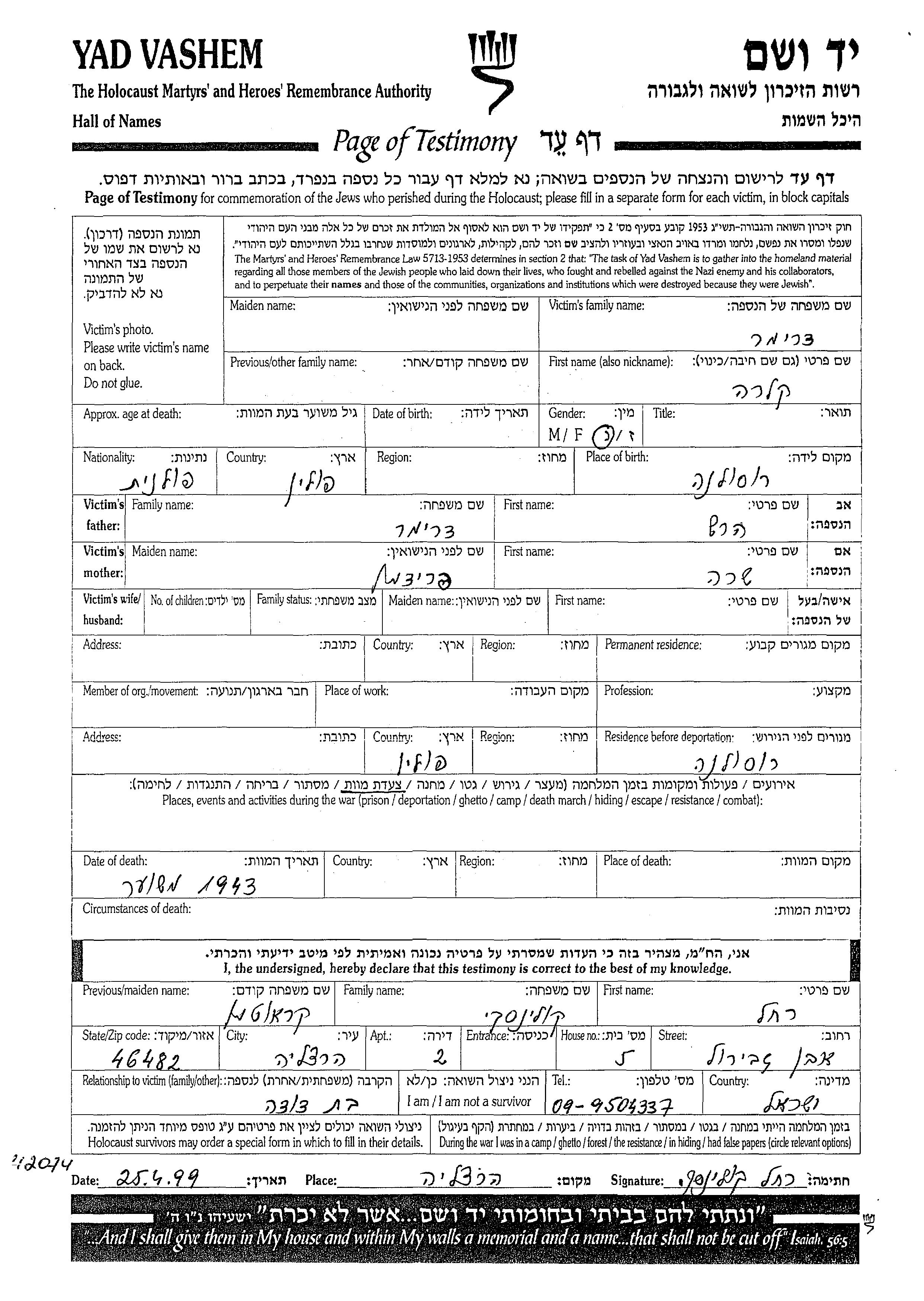 Yad Vashem - Pages of Testimony Names Memorial Collection
