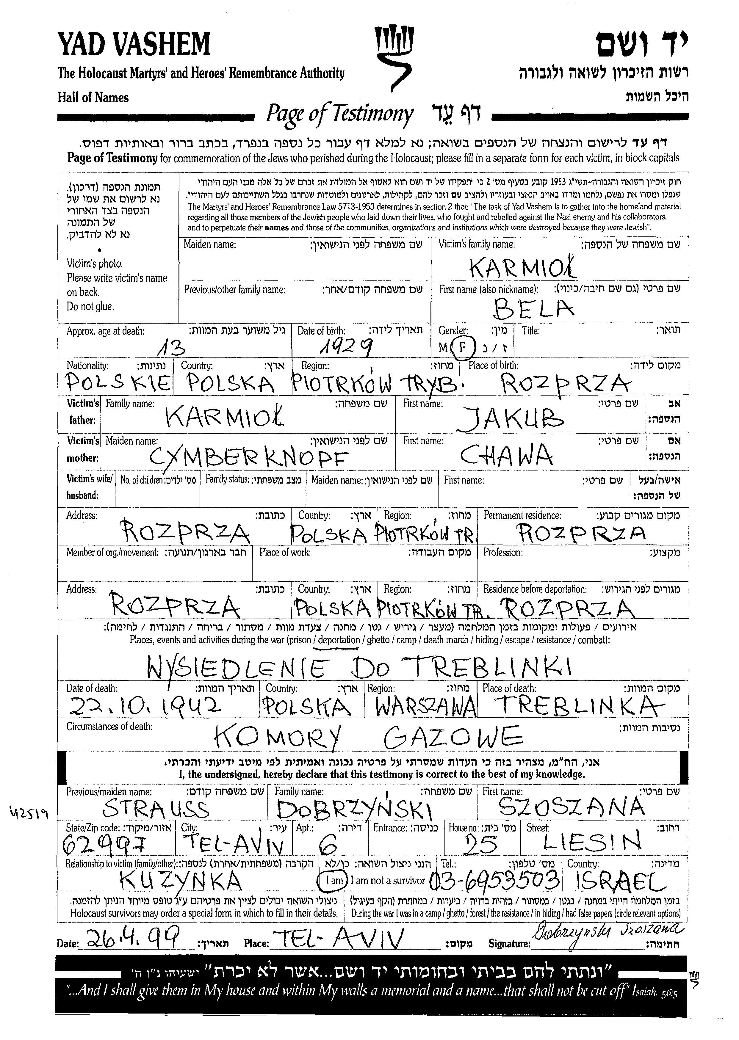 Bela Karmiol was born in Rozprza, Poland, 1929 to Jakub and Hawa. She was child. Prior to WWII she lived in Rozprza, Poland. During the war she was in Rozprza, Poland. Bela was murdered in the Shoah. Place of death: Treblinka, Poland, 22/10/1942.