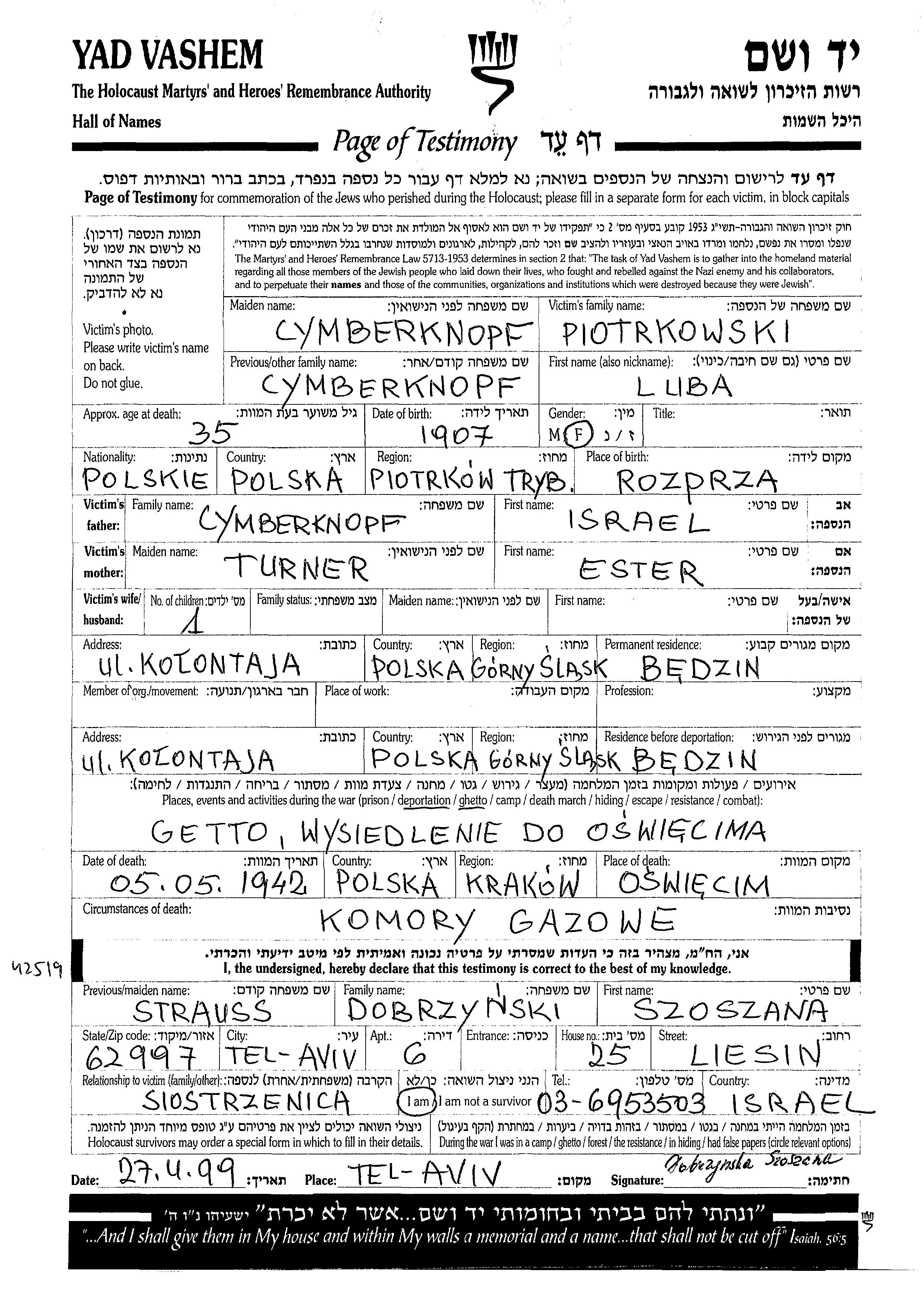 Luba Piotrkowski nee Cymberknopf was born in Rozprza, Poland, 1907 to Israel and Tera. Prior to WWII she lived in Będzin, Poland. During the war she was in Będzin, Poland. Luba was murdered in the Shoah. Place of death: Oświęcim, Poland, 05/05/1942.
