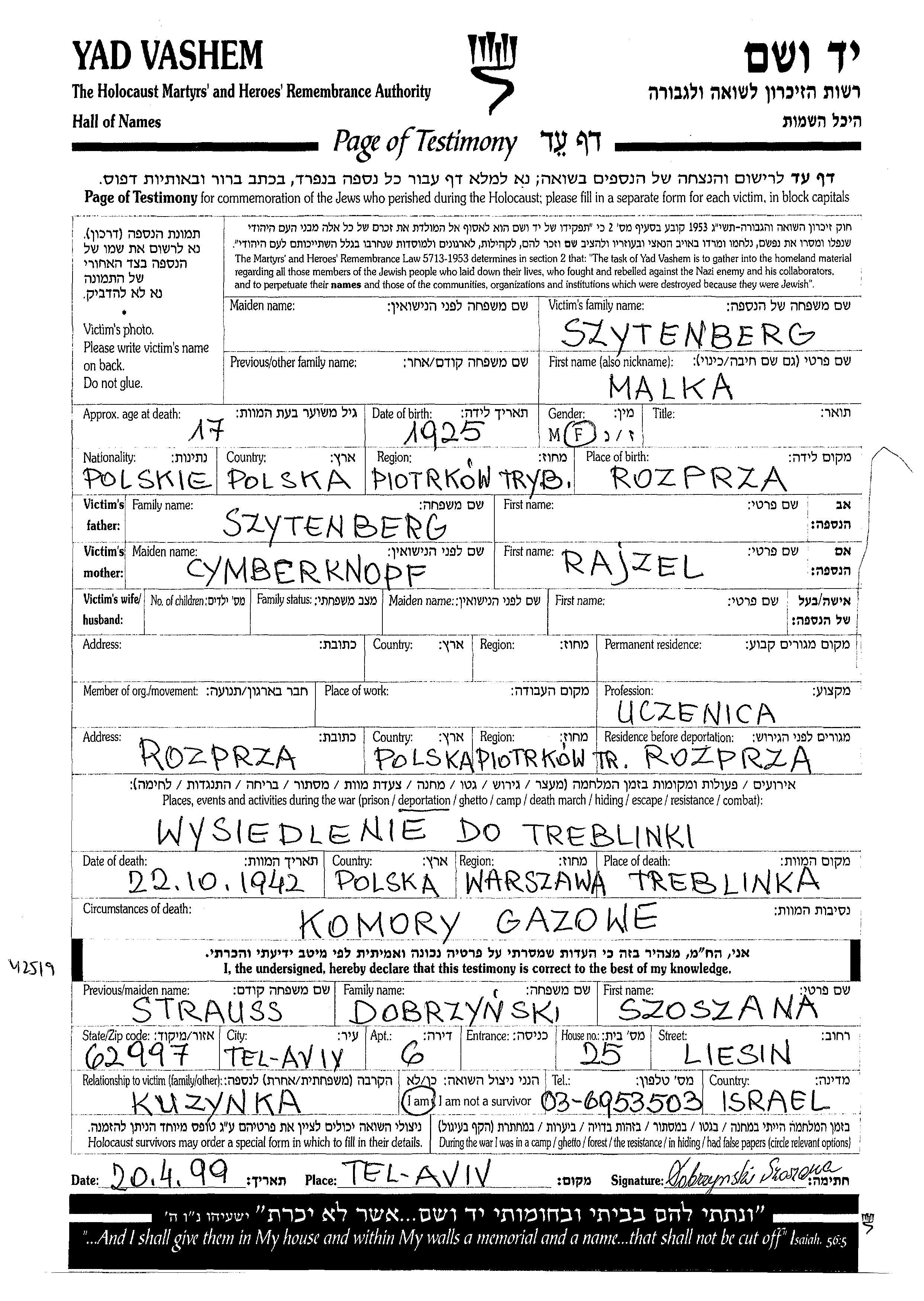 Malka Szytenberg was born in Rozprza, Poland, 1925 to Rajzel. She was a pupil. Prior to WWII she lived in Rozprza, Poland. During the war she was in Rozprza, Poland. Malka was murdered in the Shoah. Place of death: Treblinka, Poland, 22/10/1942.