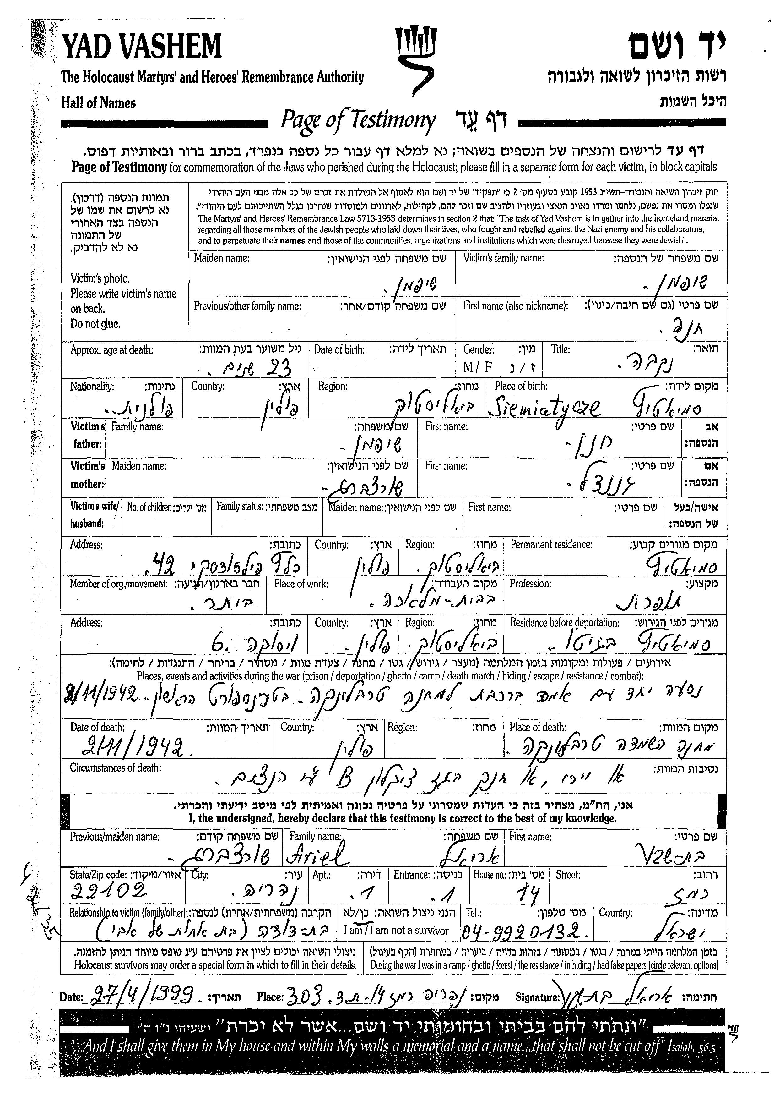 Shifman Khana Siemiatycze, Poland Page of Testimony
