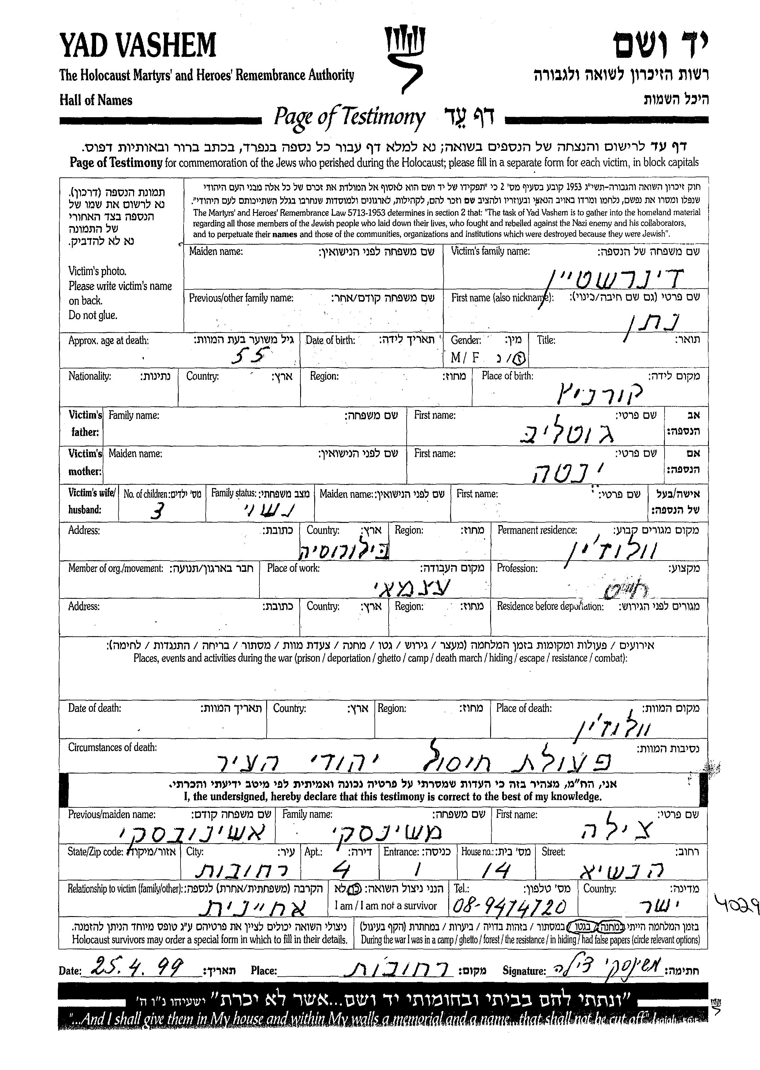 Yad Vashem - Pages of Testimony Names Memorial Collection