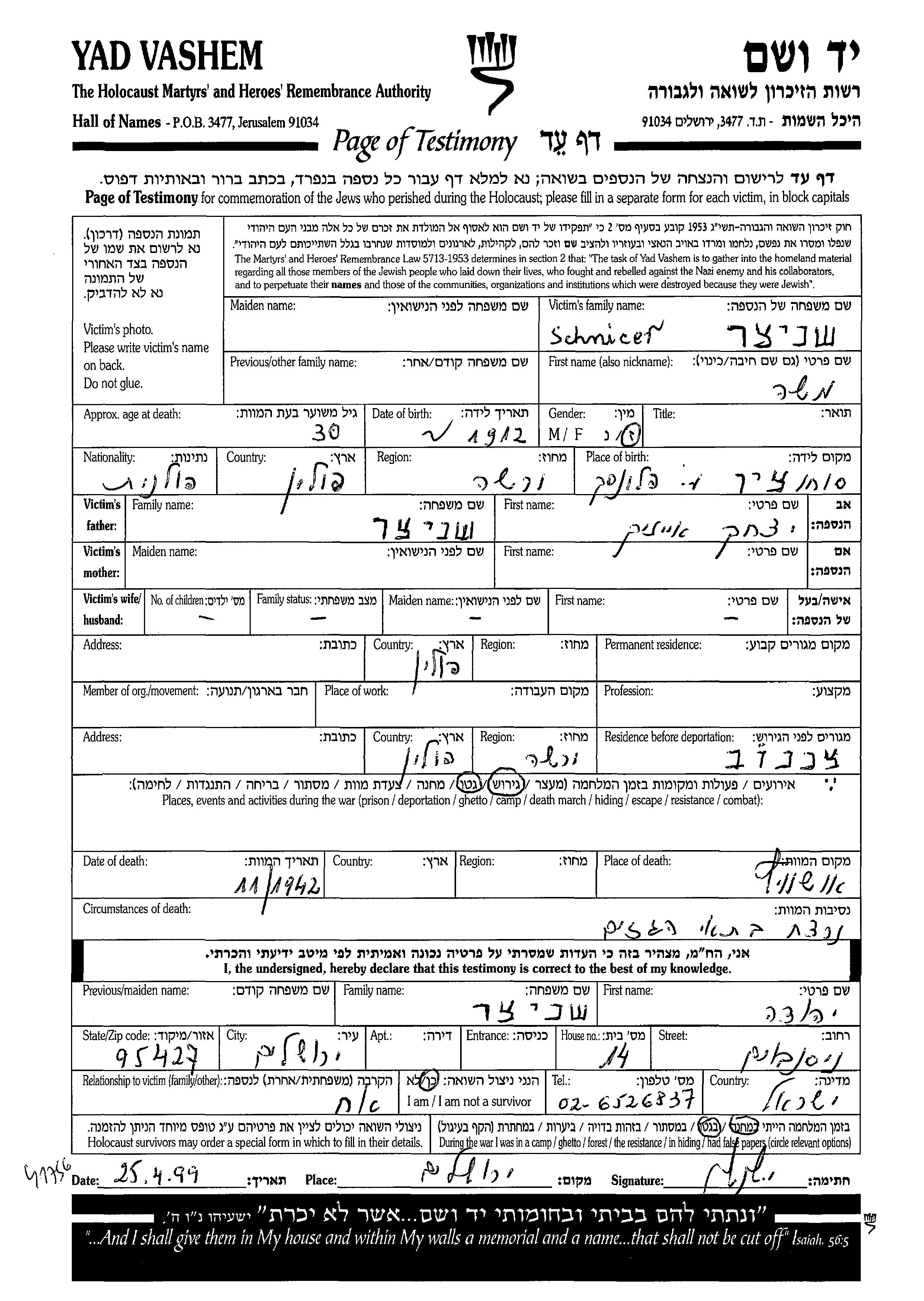 Moshe Schnicer was born in Sochocin, Poland, 1912 to Yitzkhak. Prior to WWII he lived in Poland. During the war he was in Ciechanow, Poland. Moshe was murdered in the Shoah. Place of death: Auschwitz, Poland, 11/1942.