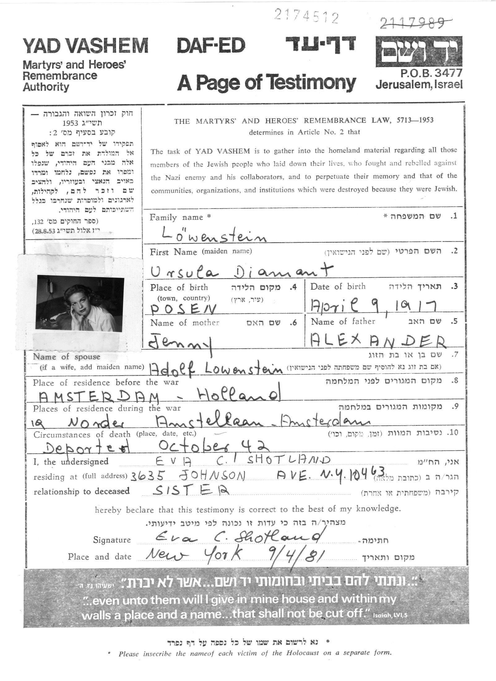 | Löwenstein | Ursula | 1917 | Amsterdam, The Netherlands | Page of Testimony |