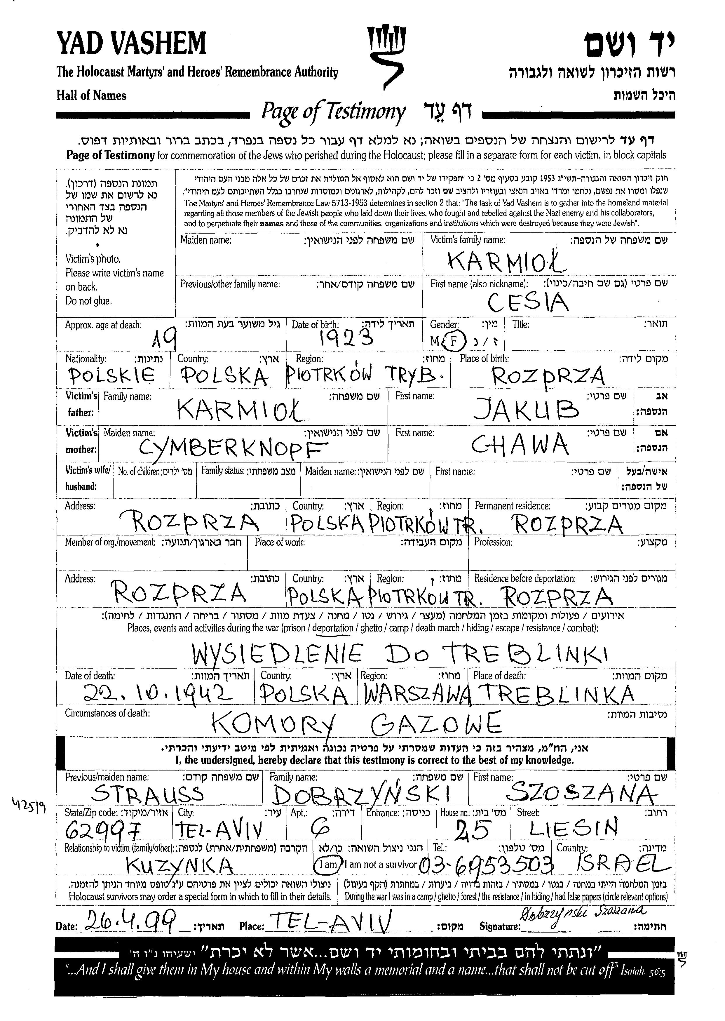 Cesia Karmiol was born in Rozprza, Poland, 1923 to Jakub and Chawa. Prior to WWII she lived in Rozprza, Poland. During the war she was in Rozprza, Poland. Cesia was murdered in the Shoah. Place of death: Treblinka, Poland, 22/10/1942.