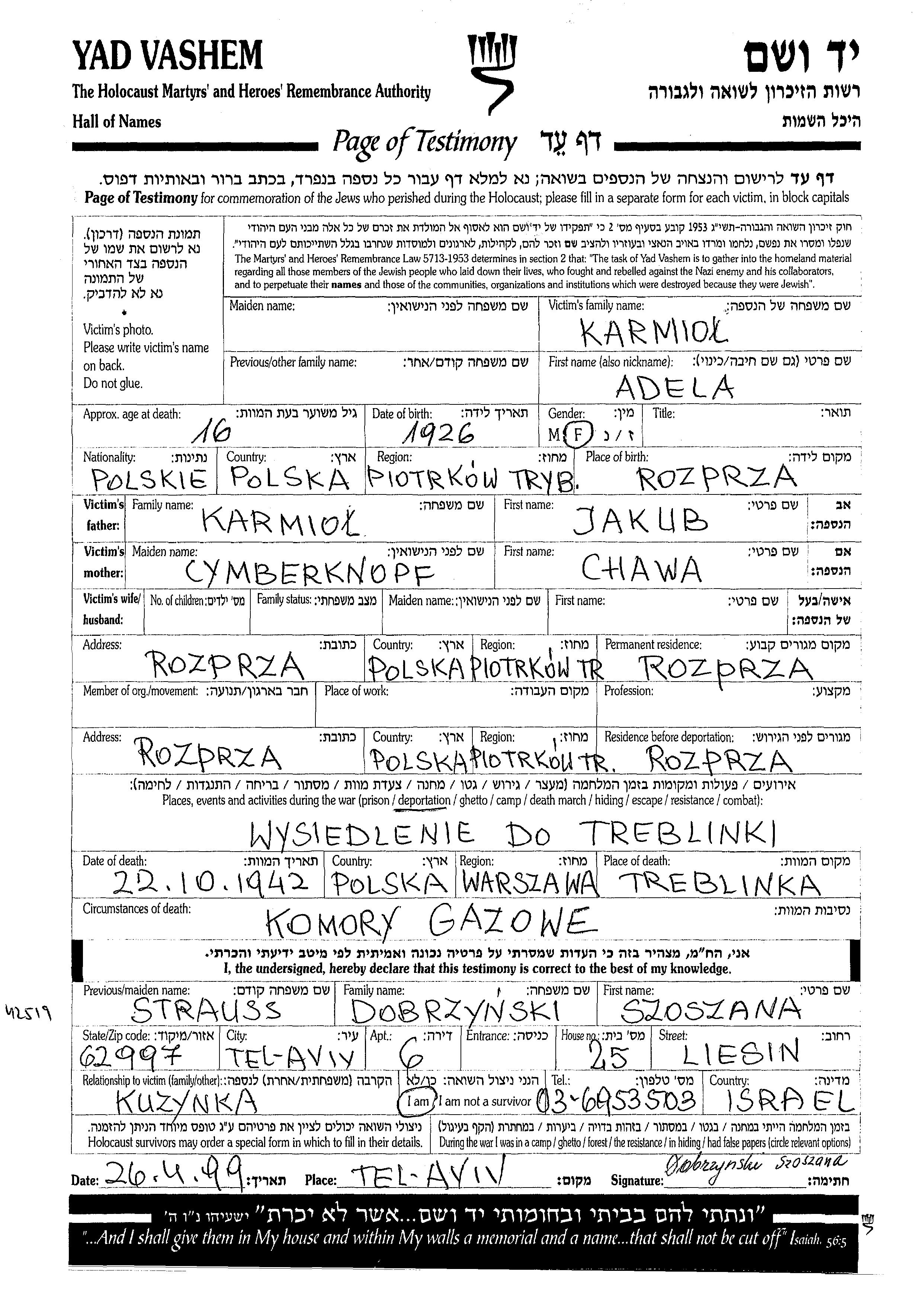 Adela Karmiol was born in Rozprza, Poland, 1926 to Jakub and Chawa. She was single. Prior to WWII she lived in Rozprza, Poland. During the war she was in Rozprza, Poland. Adela was murdered in the Shoah. Place of death: Treblinka, Poland, 22/10/1942.