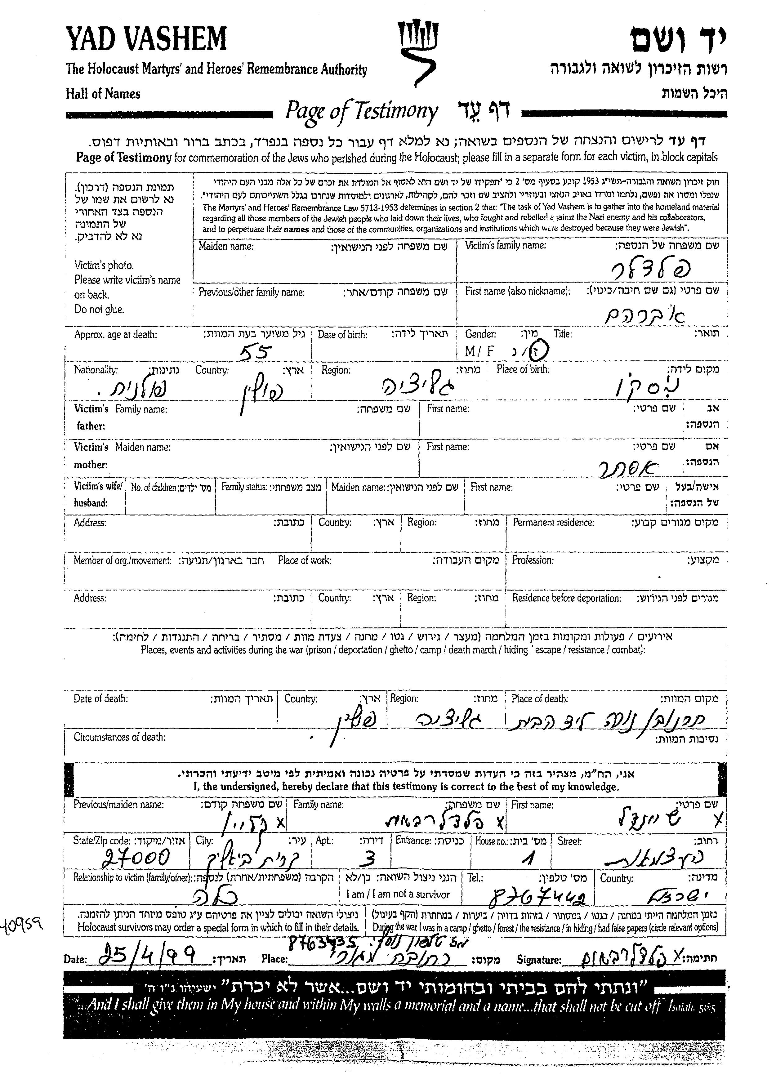 Feldler Avraham unstated place, Page of Testimony