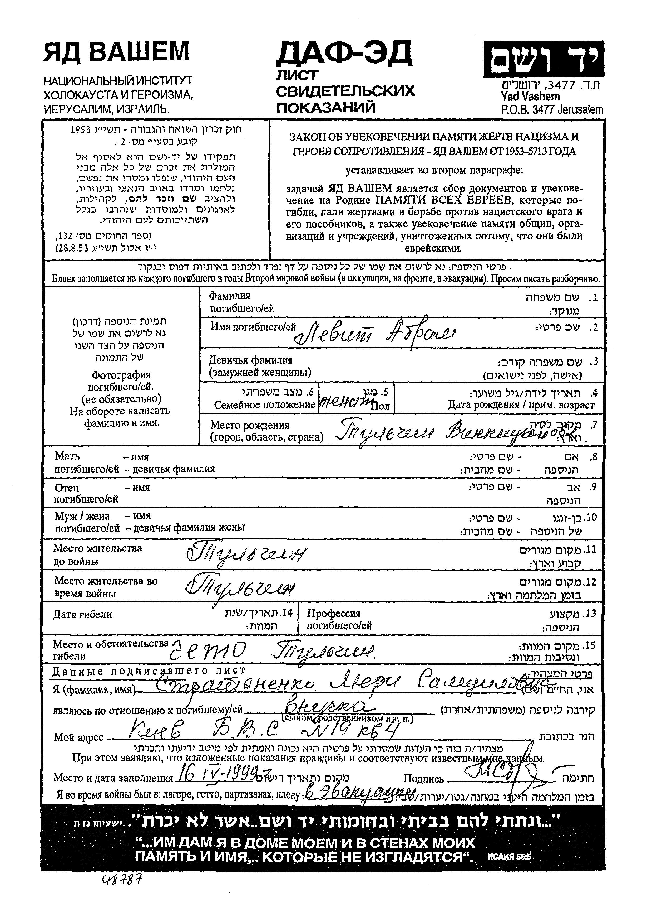 Levit Abram Tulchin, Ukraine (USSR) Page of Testimony