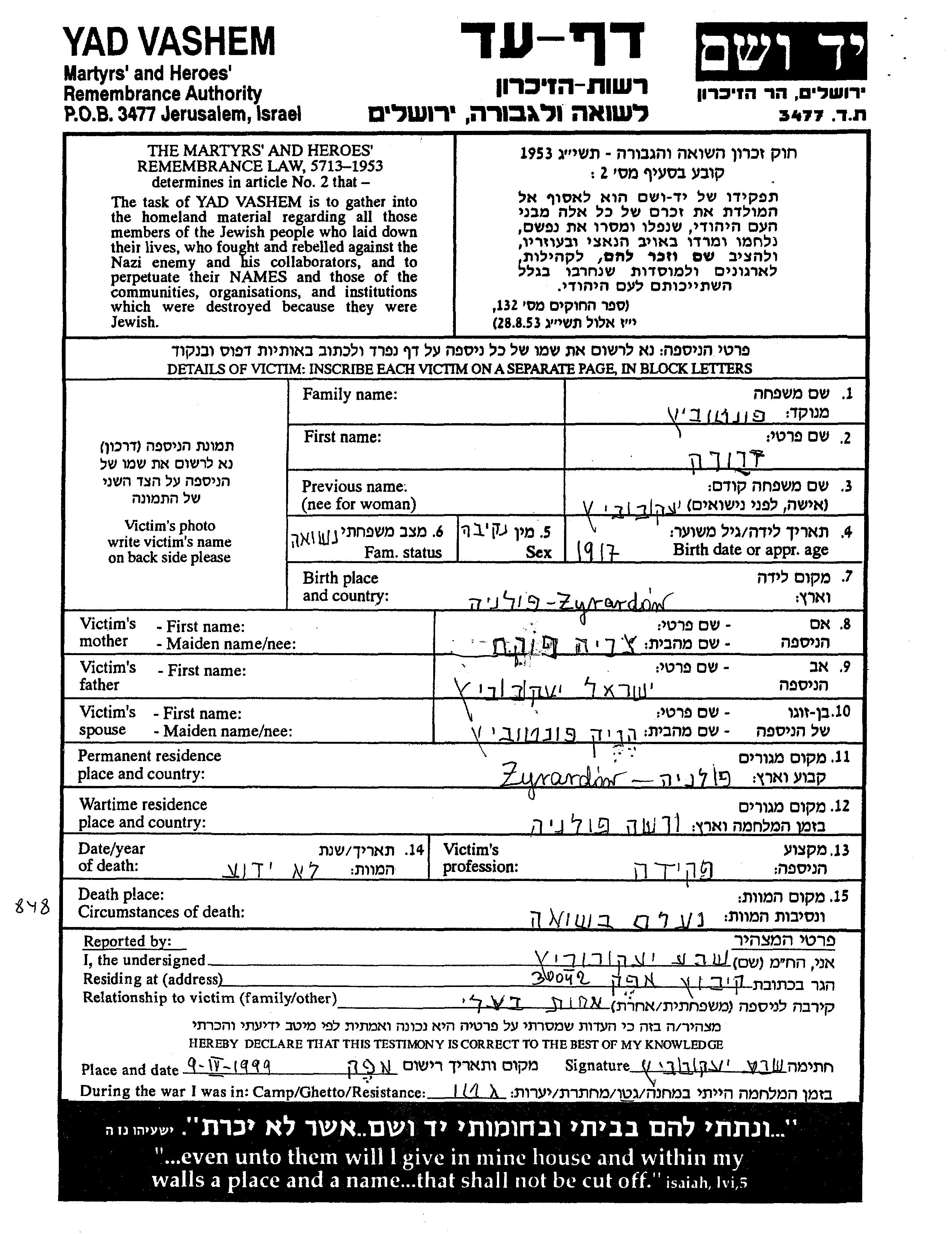 Dvora Funtovitz nee Yakubovitz was born in Zyrardow, Poland, 1917 to Yisrael and Tzvia. She was a clerk and married to Heniek. Prior to WWII she lived in Zyrardow, Poland. During the war she was in Warszawa, Poland. Dvora was murdered in the Shoah.