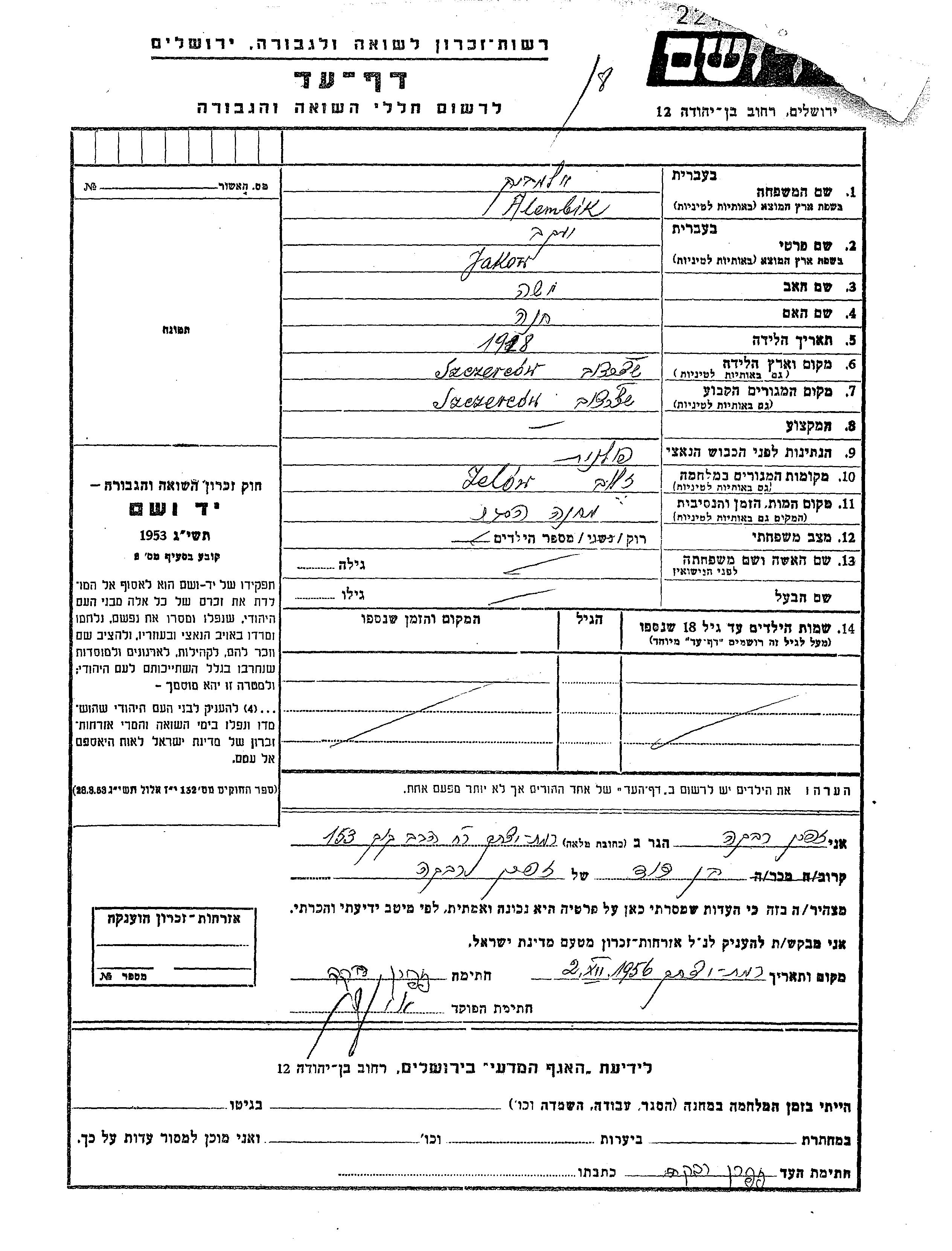 Yakow Alembik was born in Szczercow, Poland, 1918 to Moshe and Khana. He was single. Prior to WWII he lived in Szczercow, Poland. During the war he was in Zelow, Poland. Yakow was murdered in the Shoah.