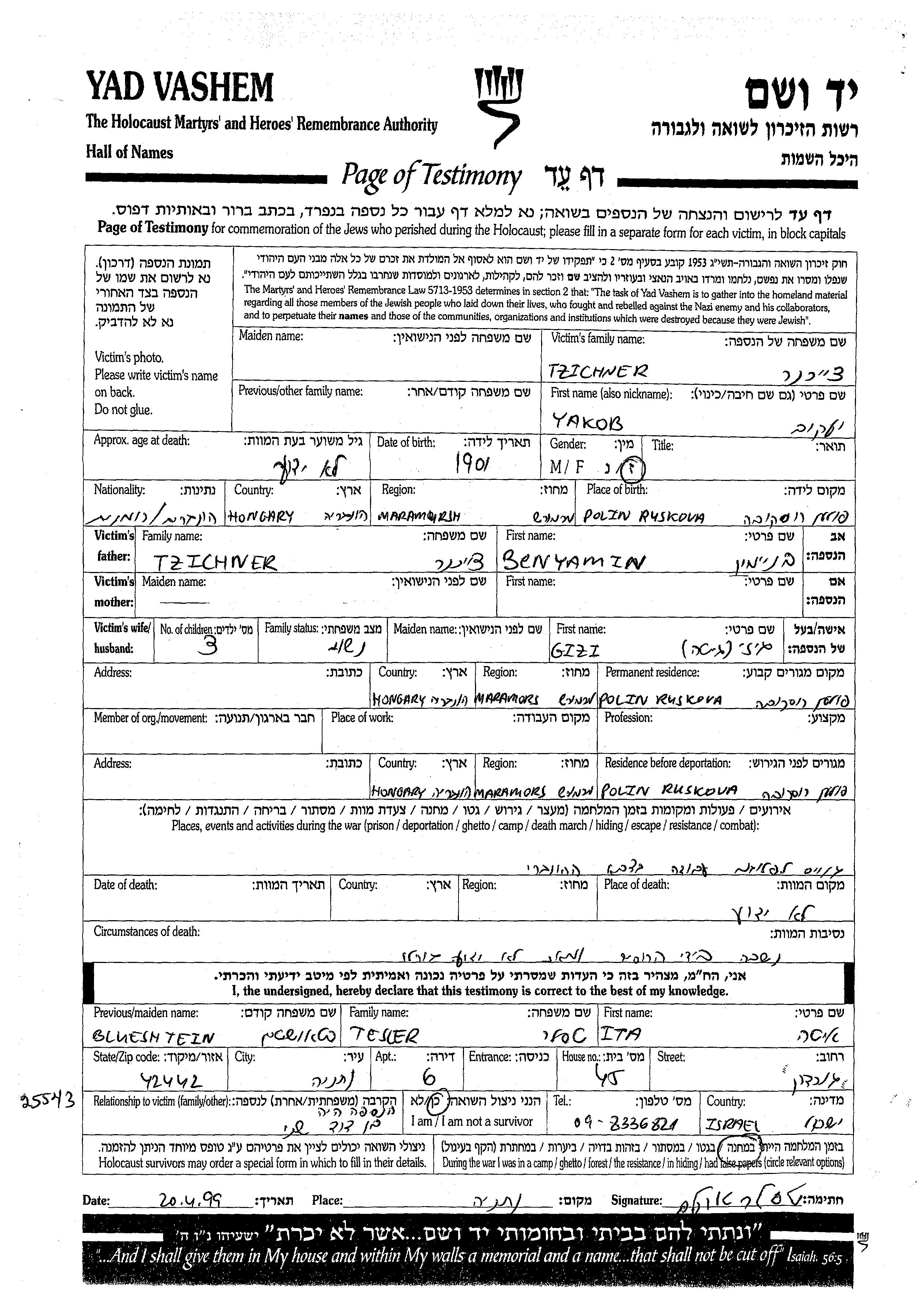 Tzichner Yakob 1901 Ruskova, Romania Page of Testimony