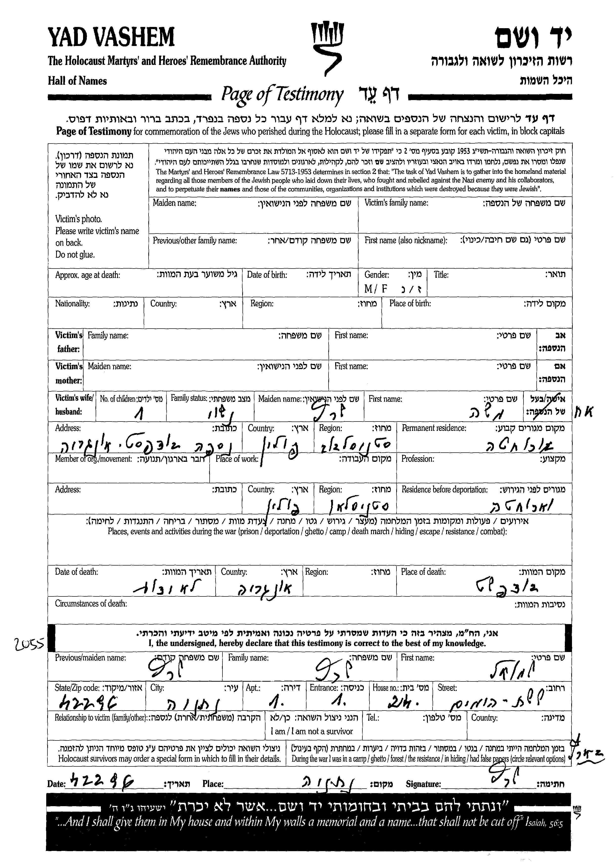 First name unknown Surname unknown. Was married. Prior to WWII lived in Stanislau, Poland. During the war was in Stanislau, Poland. Was murdered in the Shoah. Place of death: Budapest, Hungary.