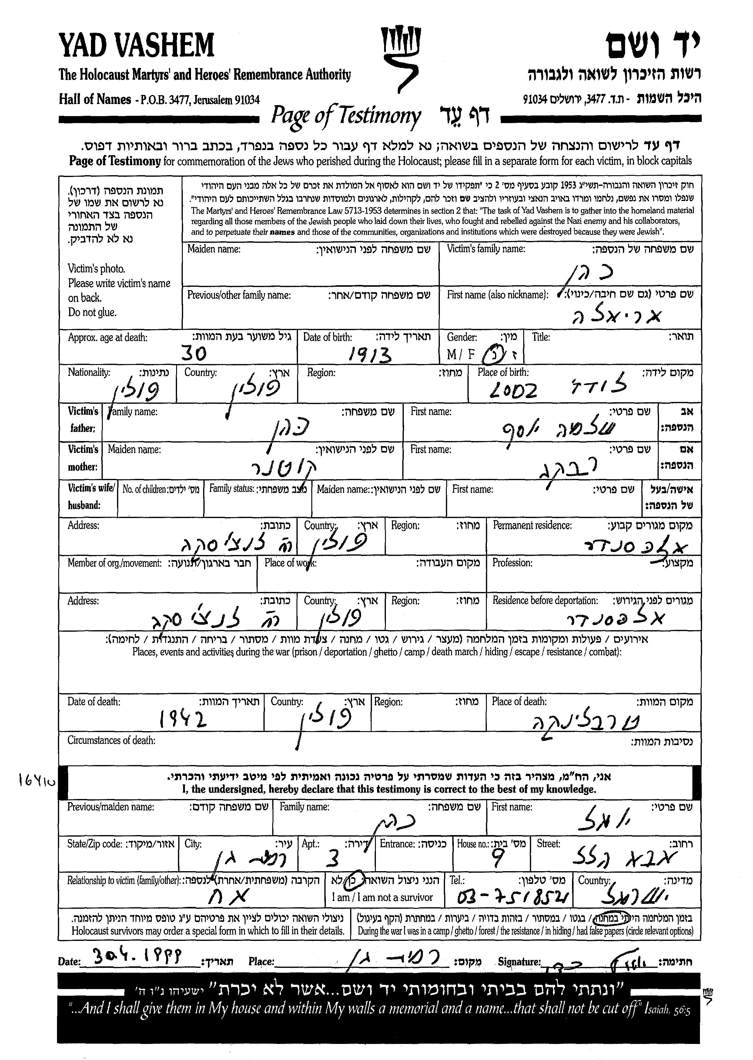 Kohen Ariela 1913 Aleksander, Poland Page of Testimony