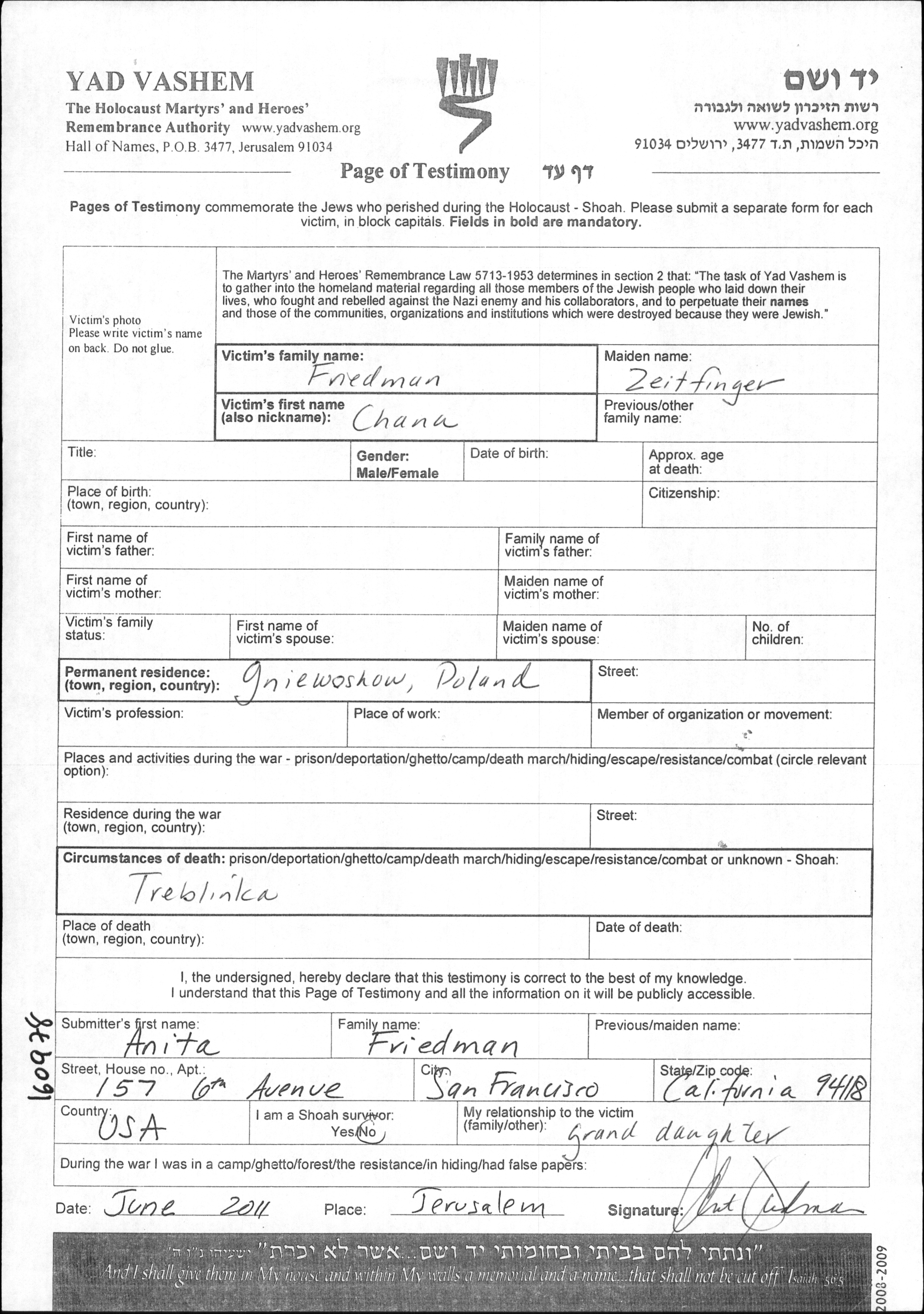 Search by last name of the submitter the Page of Testimony. This search will also show maiden names.