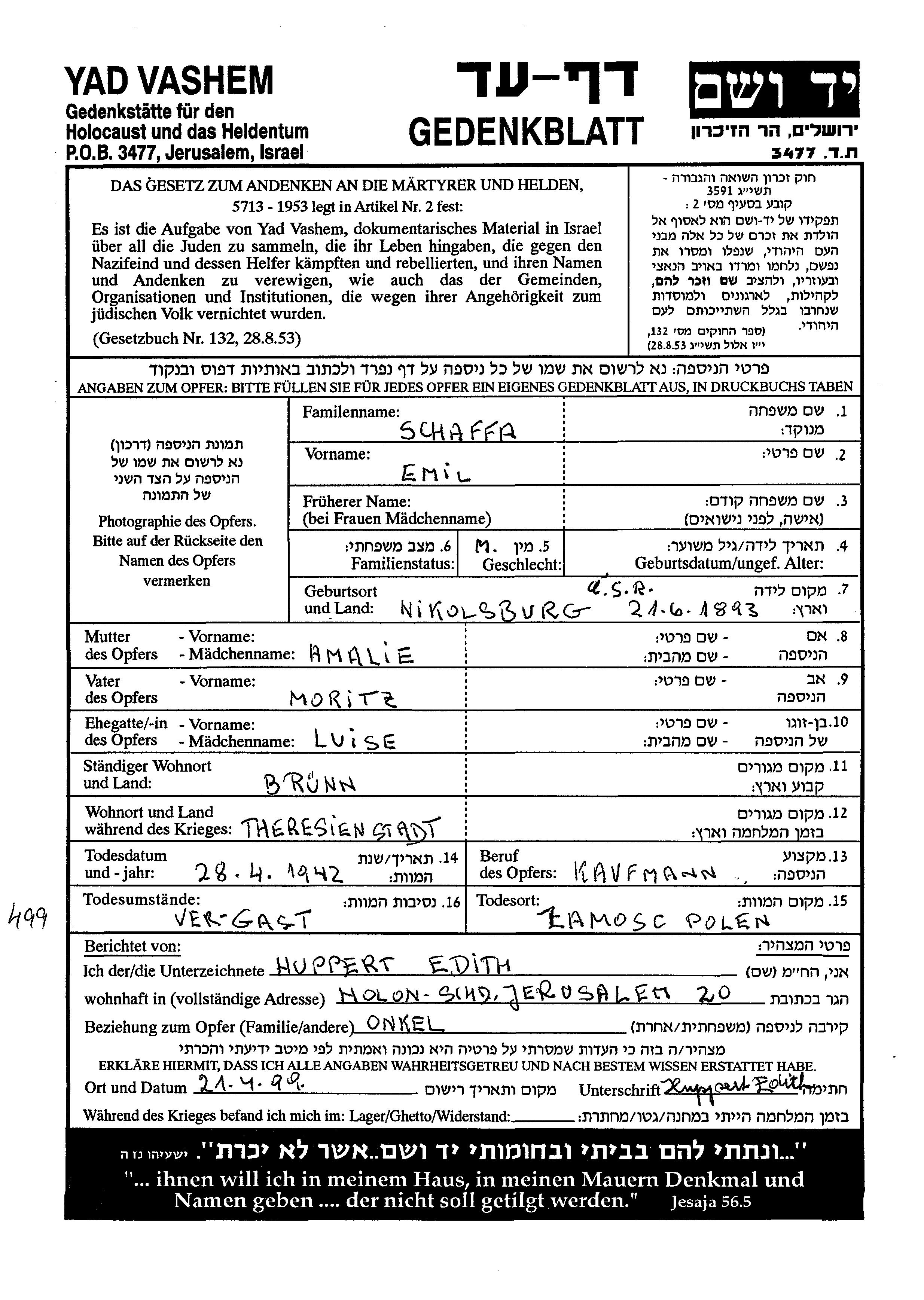 Emil Schaffa was born in Nikolsburg, Czechoslovakia to Moritz and Amalie. He was a merchant and married to Luise. Prior to WWII he lived in Bruenn, Czechoslovakia. During the war he was in Theresienstadt, Czechoslovakia.