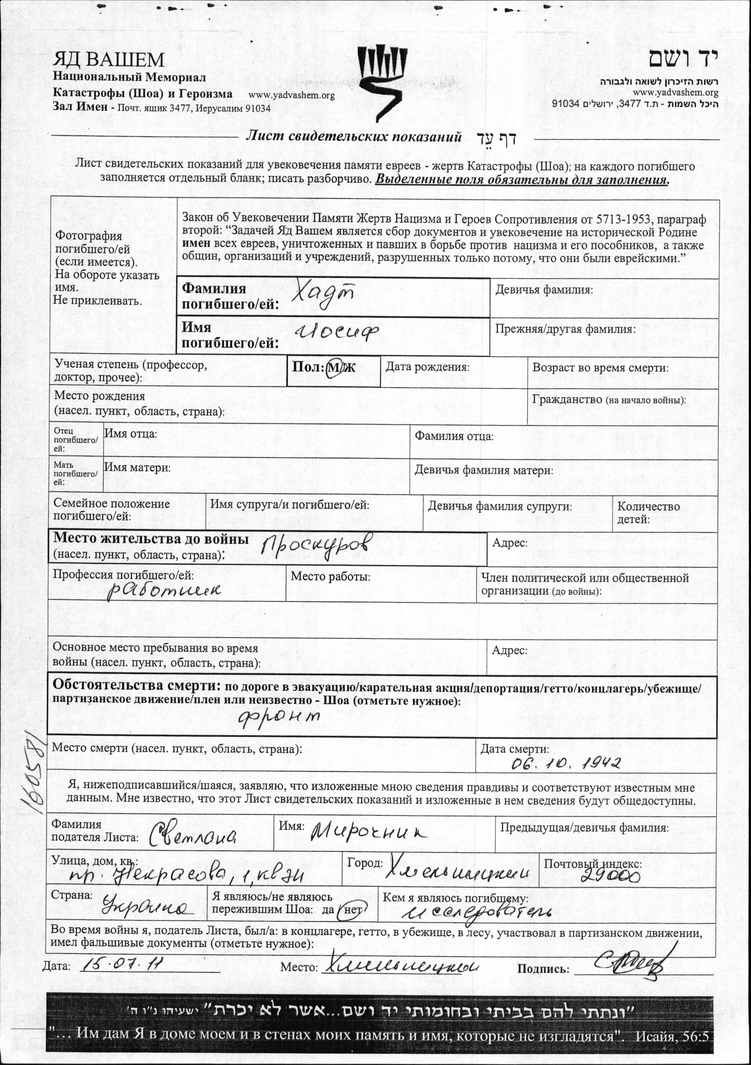 Iosif Khadt. He was a worker. Prior to WWII he lived in Proskurov, Ukraine (USSR). During the war he was in the Soviet armed forces. Iosif was killed in military service in WWII. Place of death: unknown, 06/10/1942.