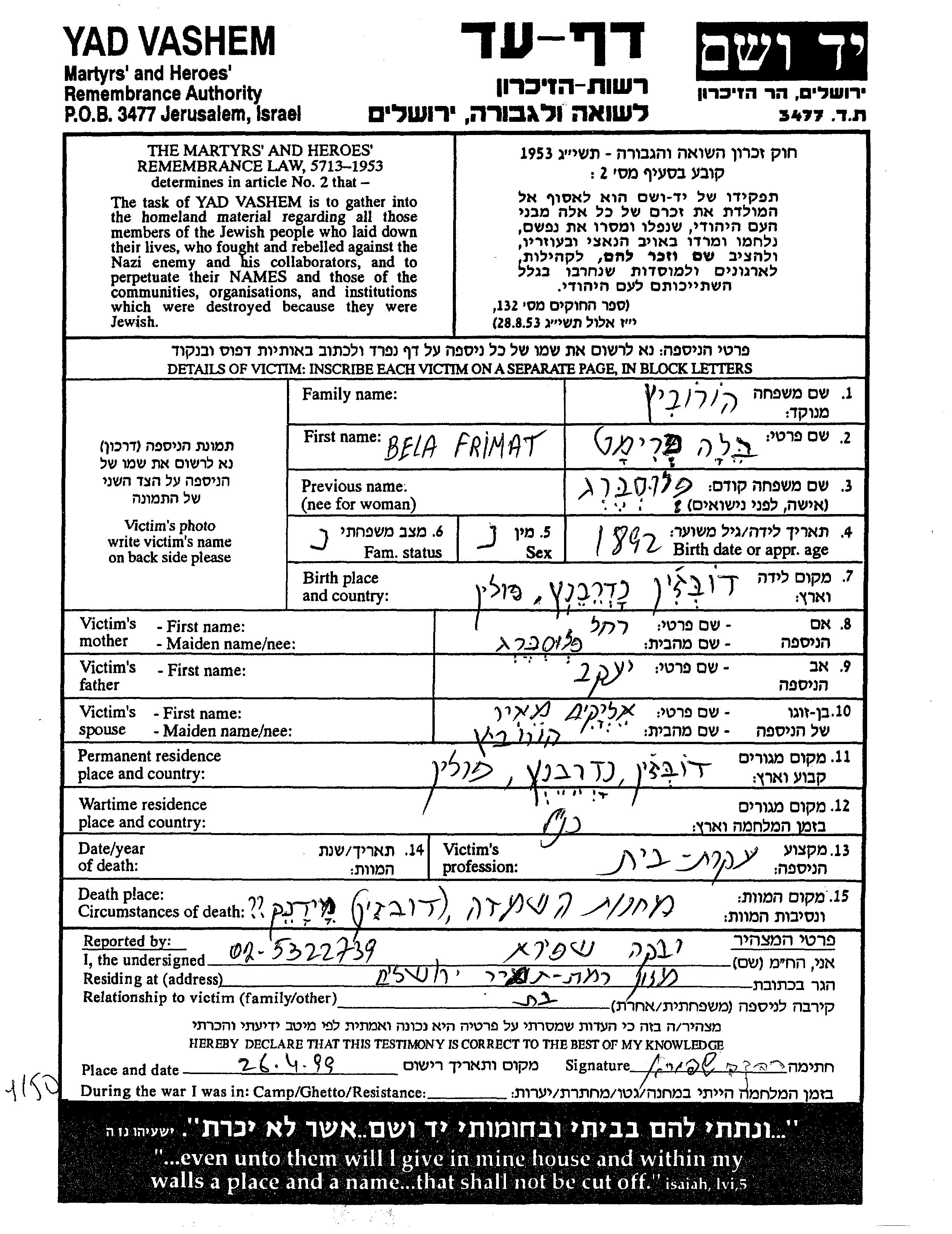Frimat Bela Horovitz nee Flusberg was born in Dobzhin nad Drvents, Poland, 1892 to Yaakov and Rakhel. She was a housewife and married to Eliakim Meir. Prior to WWII she lived in Dobzhin nad Drvents, Poland. During the war she was in Dobzhin nad Drvents, Poland. Frimat Bela was murdered in the Shoah. Place of death: Majdanek, Poland.