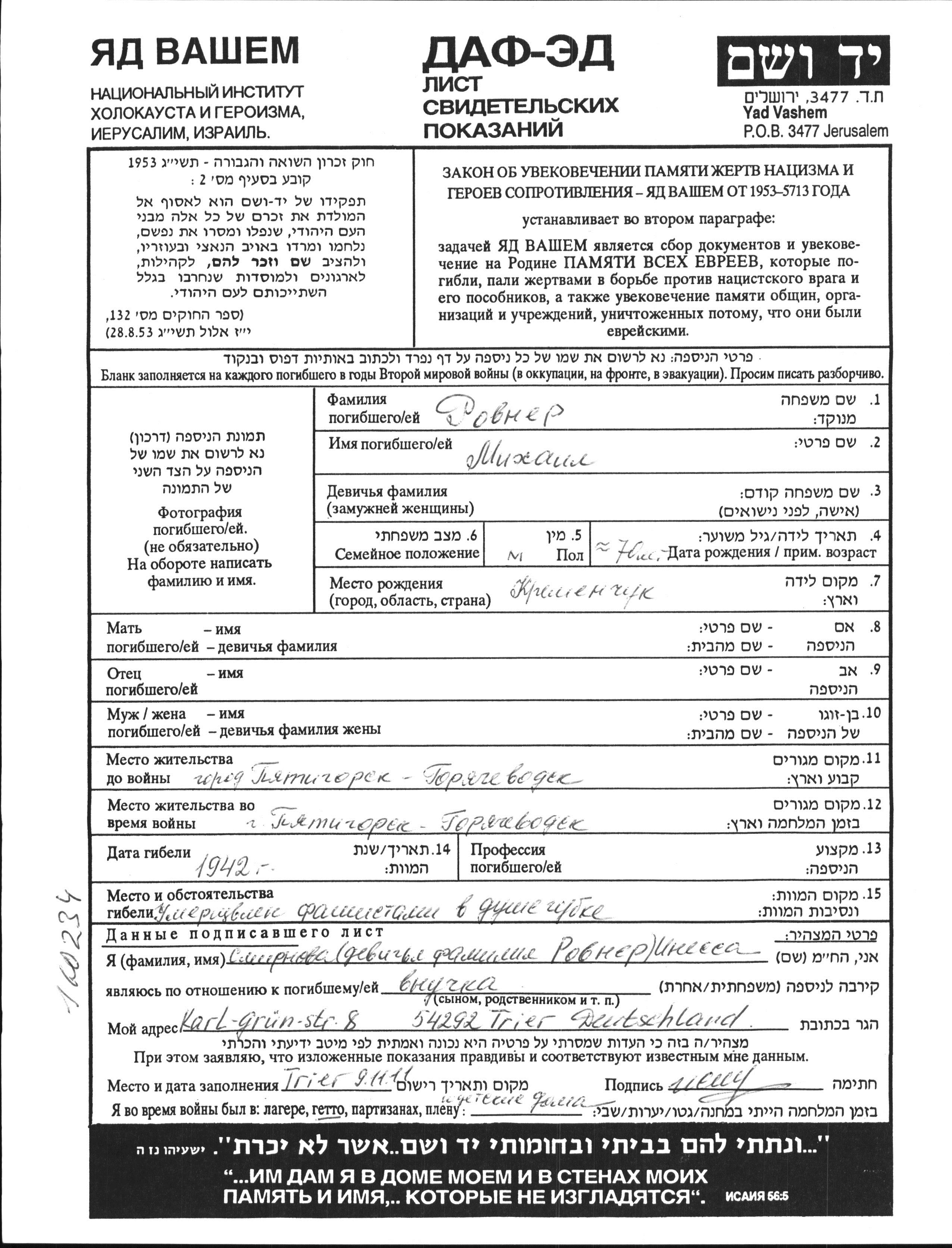 Mikhail Rovner was born in Kremenchug, Ukraine (USSR). Prior to WWII he lived in Goryachevodskiy, Russia (USSR). During the war he was in Goryachevodskiy, Russia (USSR). Mikhail was murdered in the Shoah. Place of death: unknown, 1942.