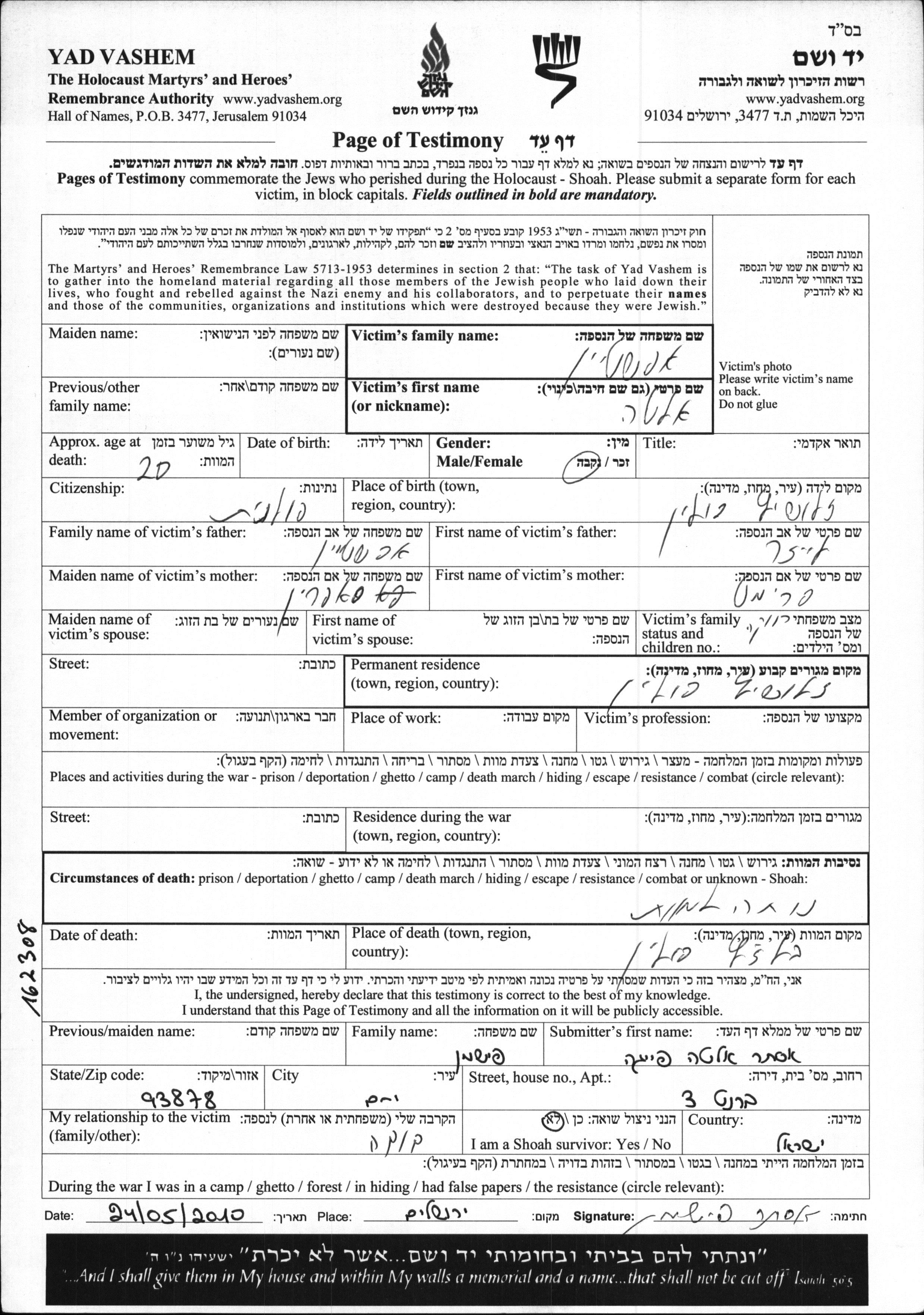 Alte Epshtein was born in Zloczew, Poland to Leizer and Frimet nee Safrin. She was single. Prior to WWII she lived in Zloczew, Poland. Alte was murdered in the Shoah. Place of death: Belzec, Poland.