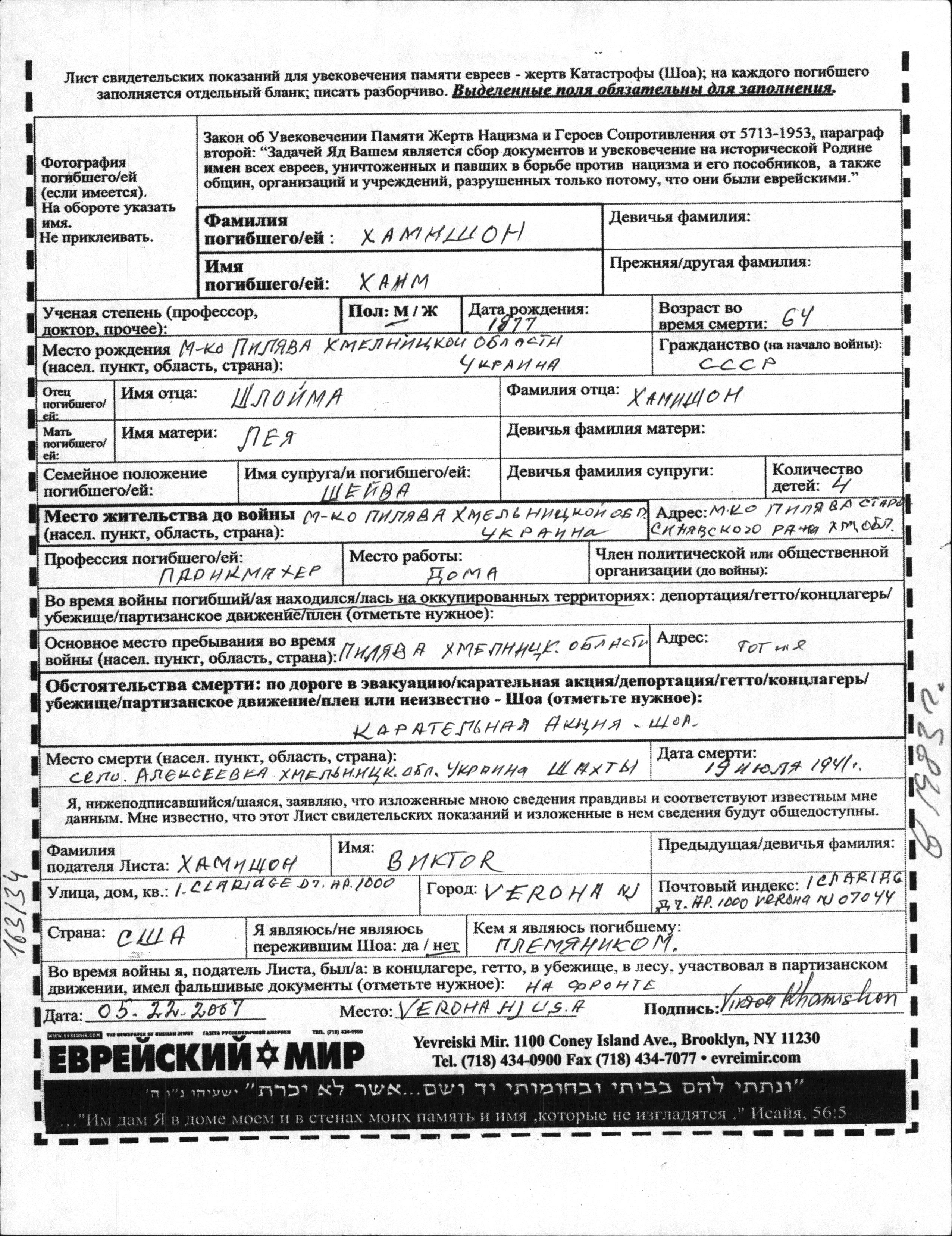 Khaim Khamishon was born in Pilyava, Ukraine (USSR), 1877 to Shloyma and Leya. He was a hairdresser and married to Sheyva. Prior to WWII he lived in Pilyava, Ukraine (USSR). During the war he was in Pilyava, Ukraine (USSR).