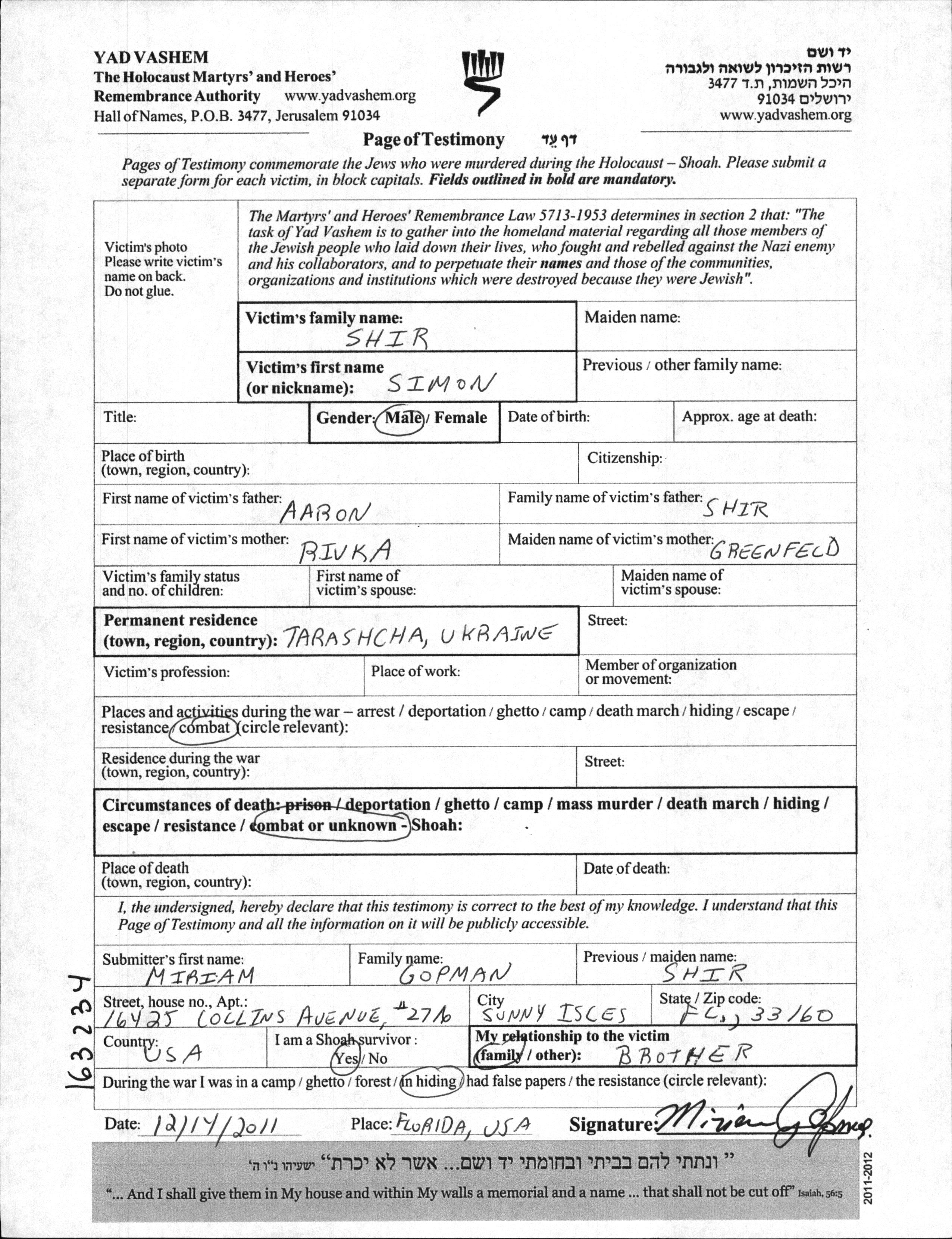 Shir Simon Tarashcha, Ukraine (USSR) Page of Testimony