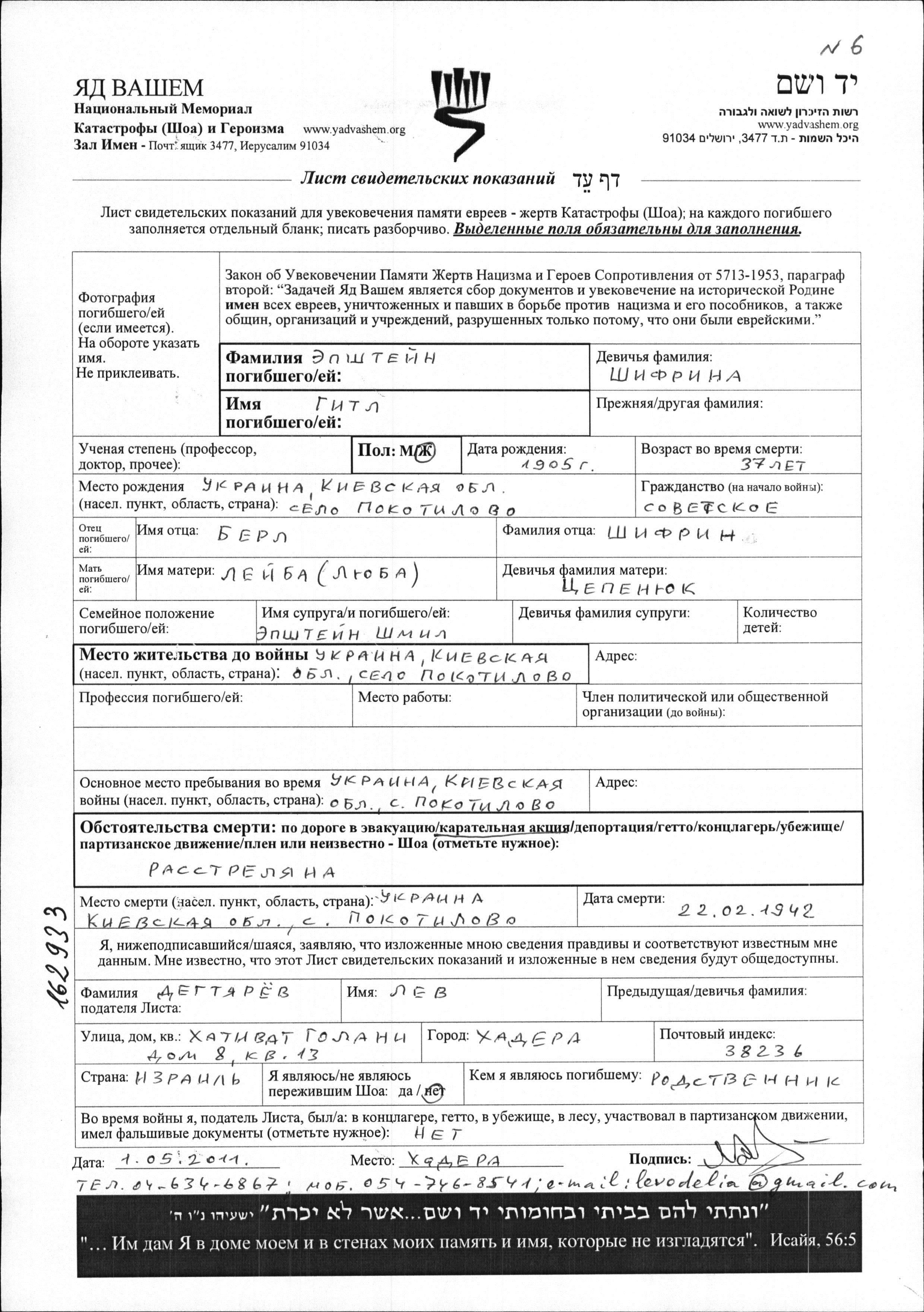 Gitl Epshteyn nee Shifrina was born in Pokotilovo, Ukraine (USSR), 1905 to Berl and Leybl Lyuba nee Tzepenyuk. She was married to Shmil. Prior to WWII she lived in Pokotilovo, Ukraine (USSR). During the war she was in Pokotilovo, Ukraine (USSR). Gitl was murdered in the Shoah. Place of death: Pokotilovo, Ukraine (USSR), 22/02/1942.