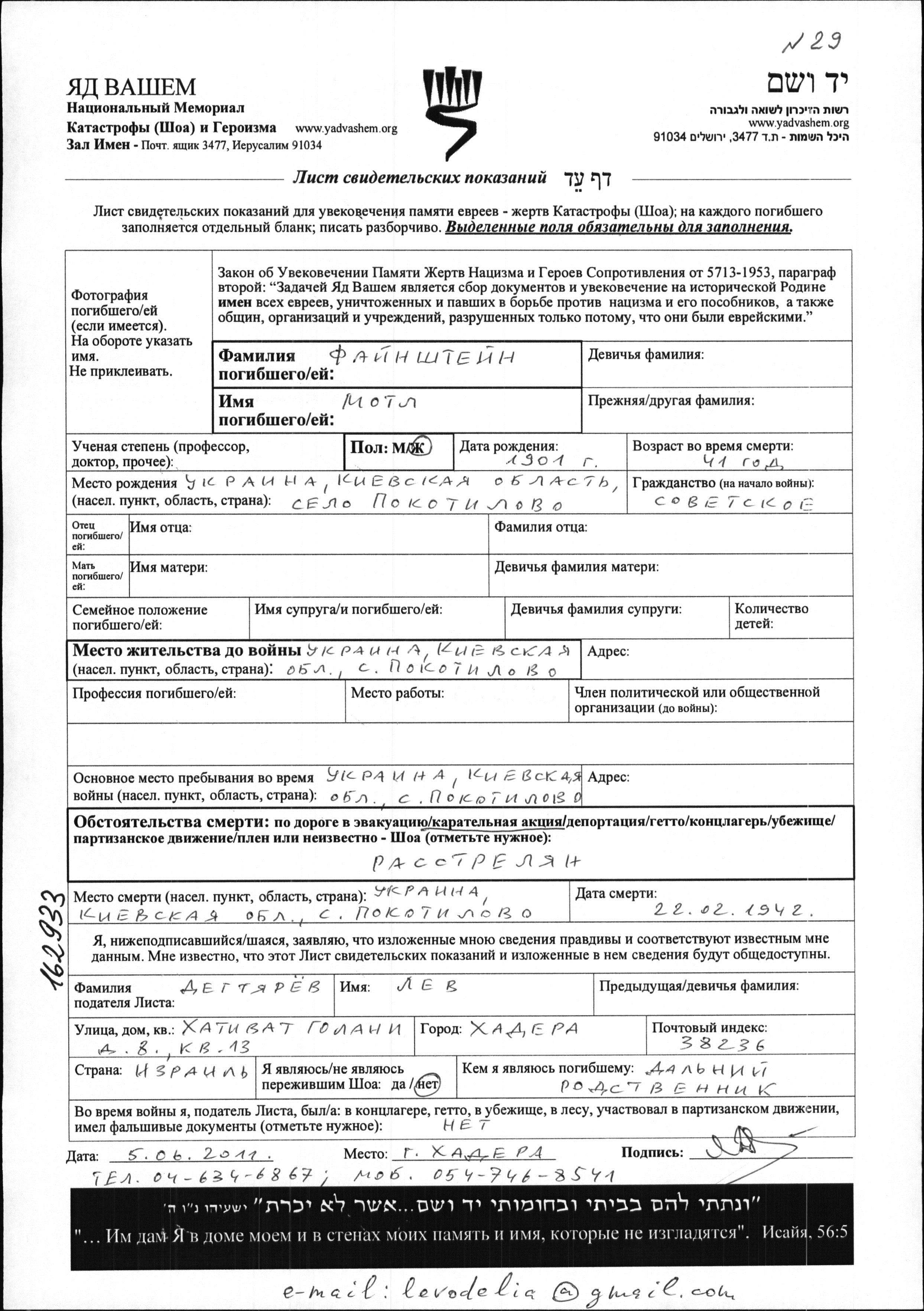Motl Faynshteyn was born in Pokotilovo, Ukraine (USSR), 1901. Prior to WWII she lived in Pokotilovo, Ukraine (USSR). During the war she was in Pokotilovo, Ukraine (USSR). Motl was murdered in the Shoah. Place of death: Pokotilovo, Ukraine (USSR), 22/02/1942.