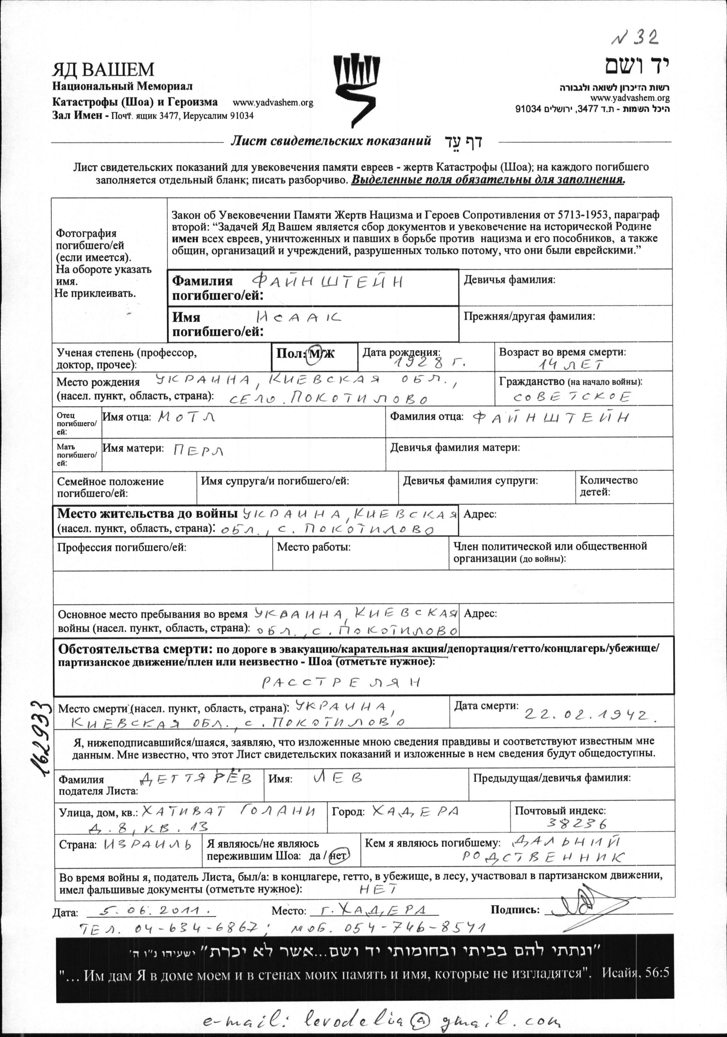 Isaak Faynshteyn was born in Pokotilovo, Ukraine (USSR), 1928 to Motl and Perl. He was teenager. Prior to WWII he lived in Pokotilovo, Ukraine (USSR). During the war he was in Pokotilovo, Ukraine (USSR). Isaak was murdered in the Shoah. Place of death: Pokotilovo, Ukraine (USSR), 22/02/1942.
