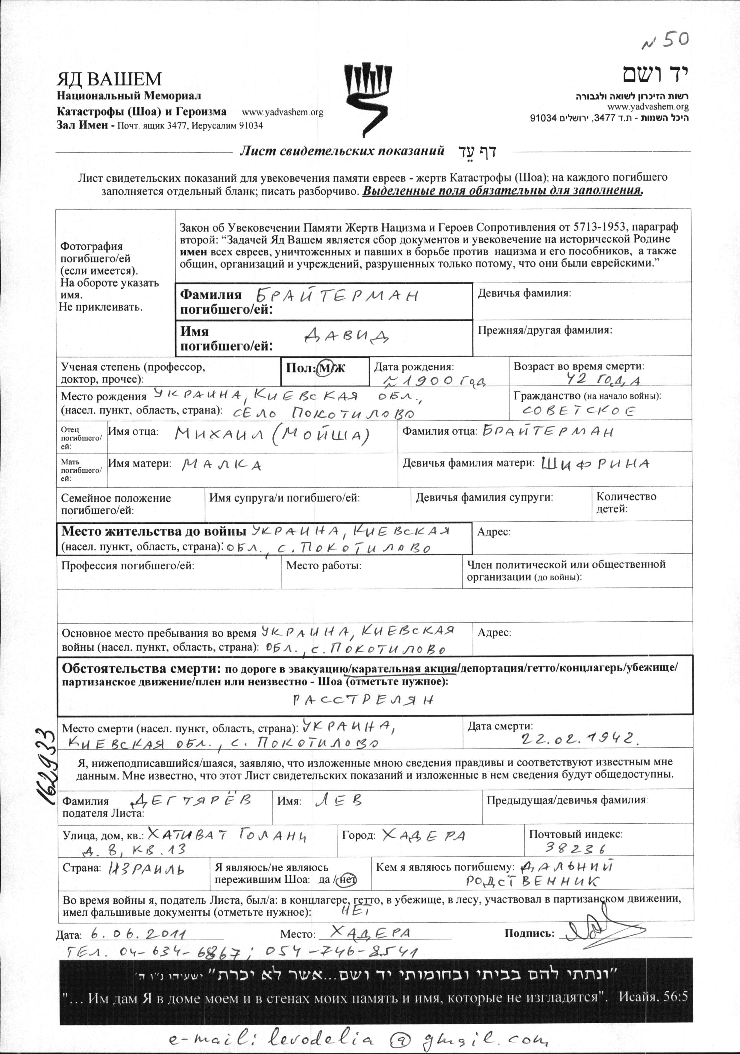 David Brayterman was born in Pokotilovo, Ukraine (USSR), 1900 to Mikhail Moysha and Malka nee Shifrina. Prior to WWII he lived in Pokotilovo, Ukraine (USSR). During the war he was in Pokotilovo, Ukraine (USSR). David was murdered in the Shoah. Place of death: Pokotilovo, Ukraine (USSR), 22/02/1942.