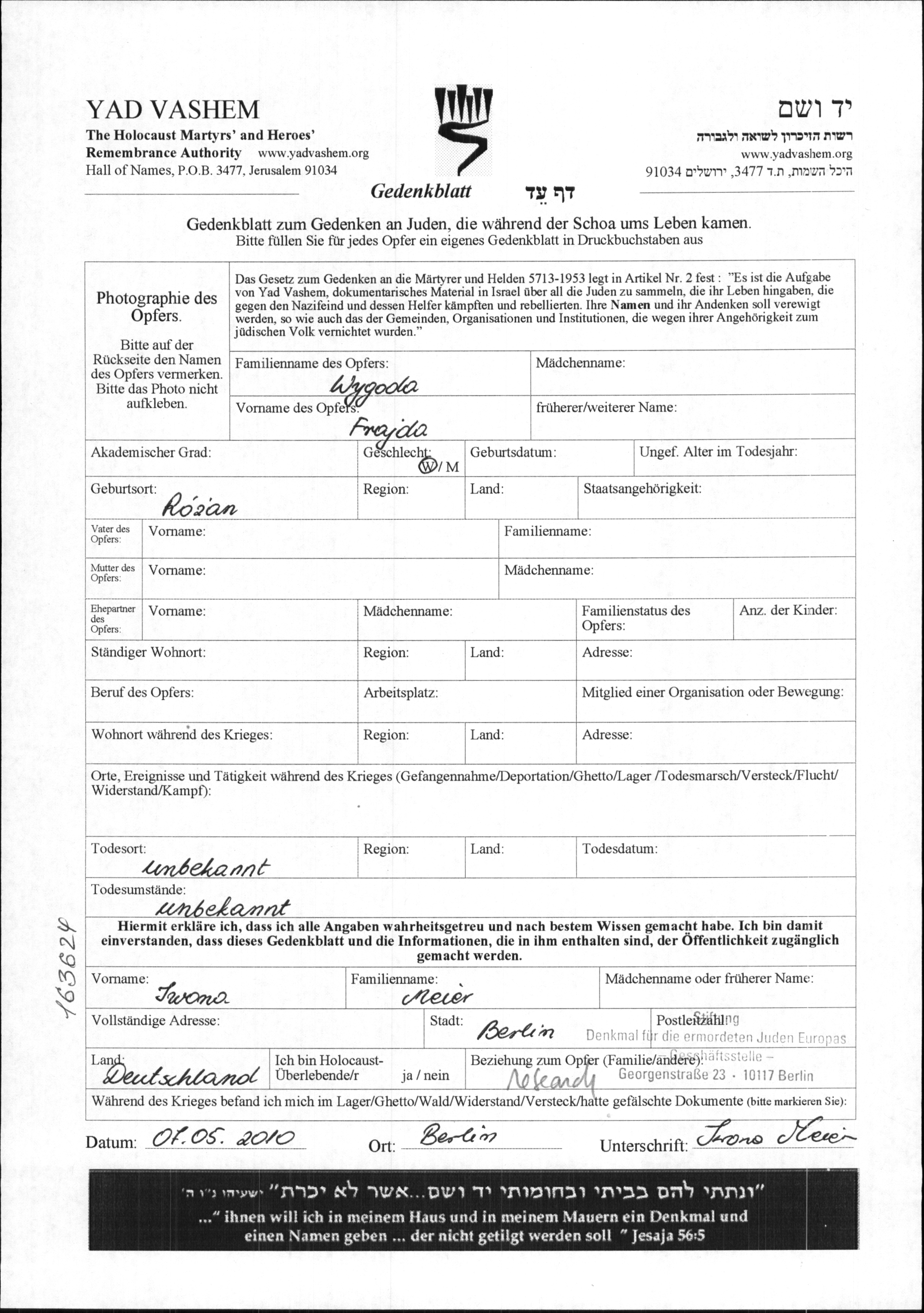 Wygoda Frajda unstated place, Page of Testimony