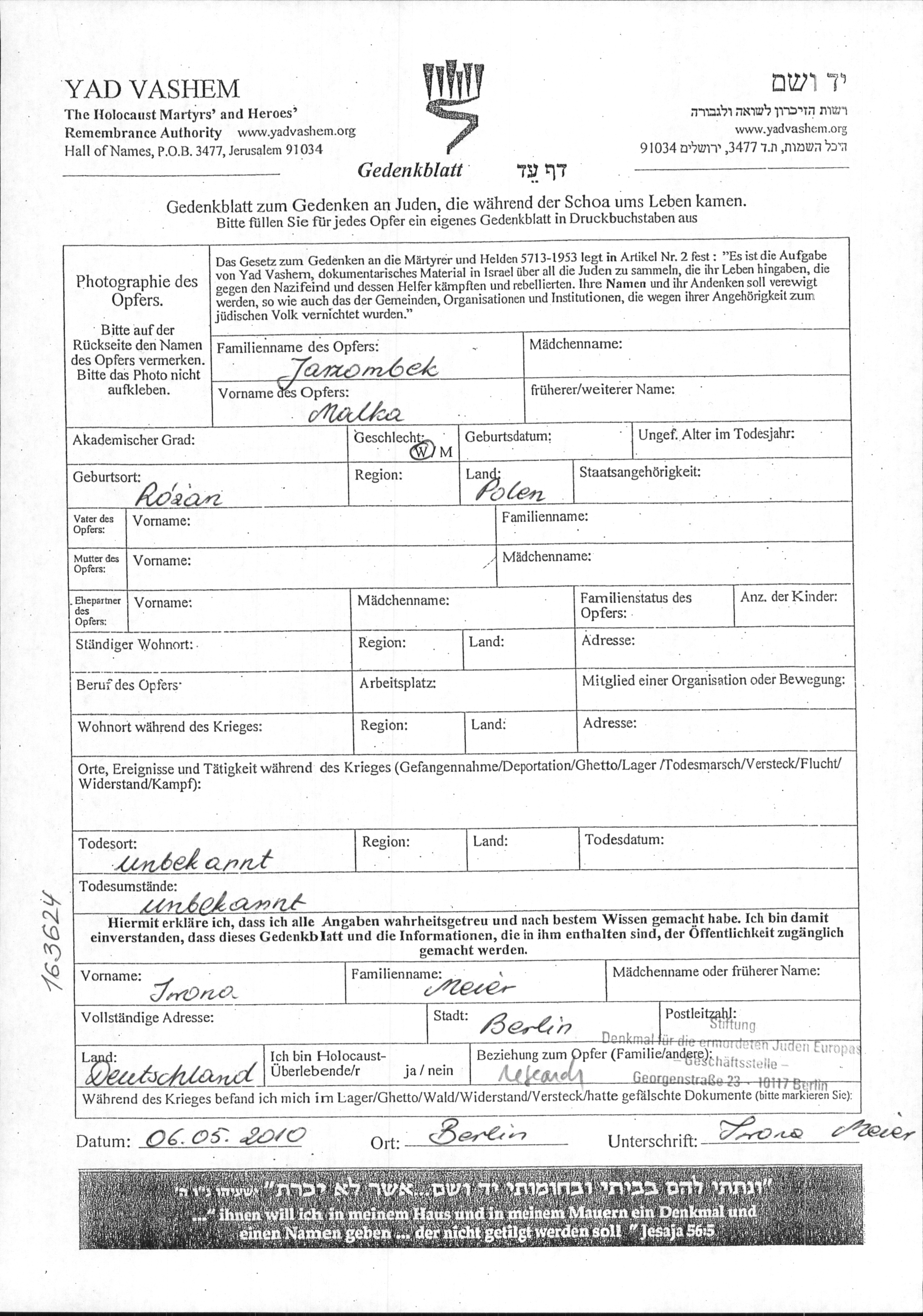 Jarzombek Malka unstated place, Page of Testimony