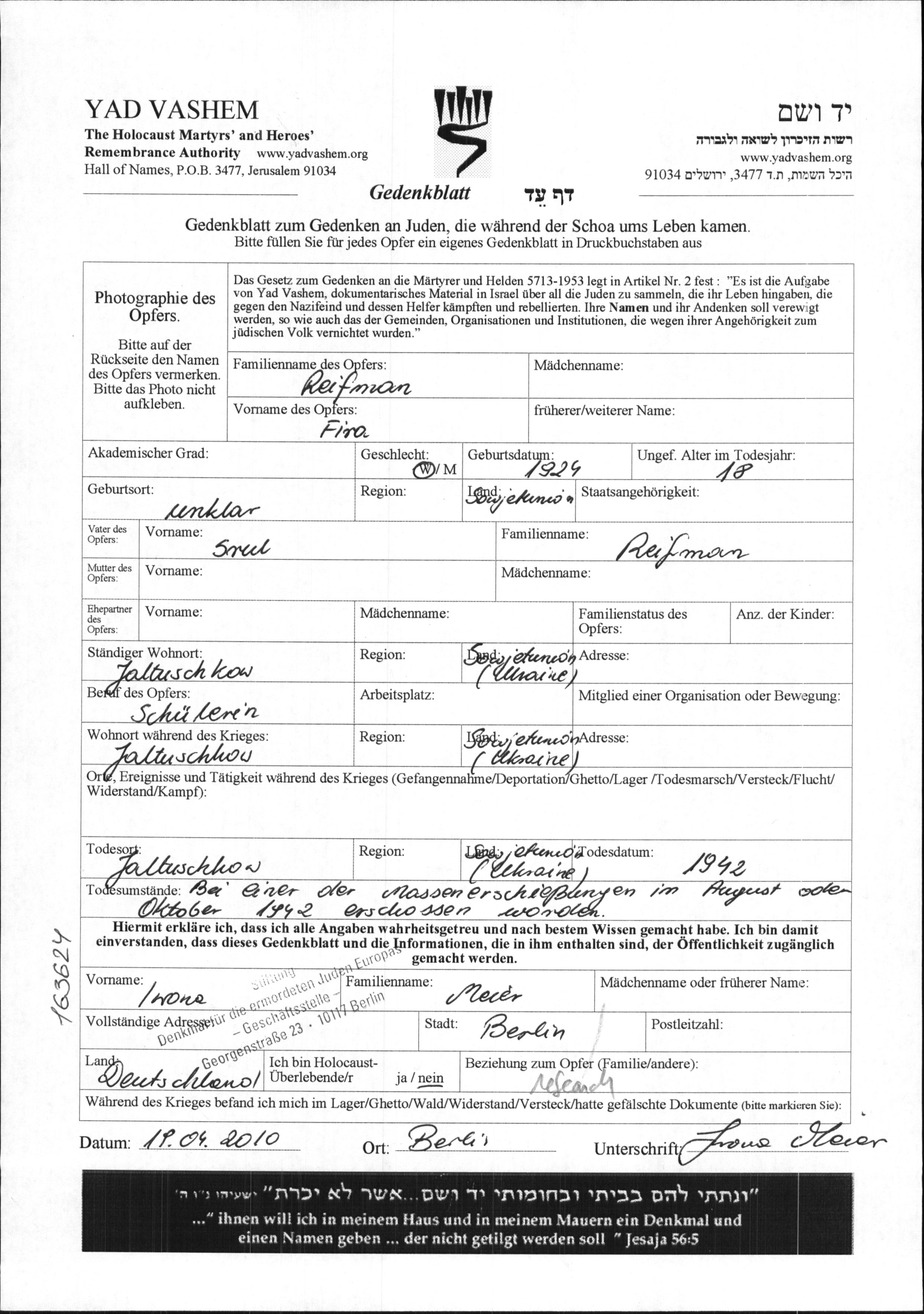 Reifman Fira 1924 Yaltushkov, Ukraine (USSR) Page of Testimony