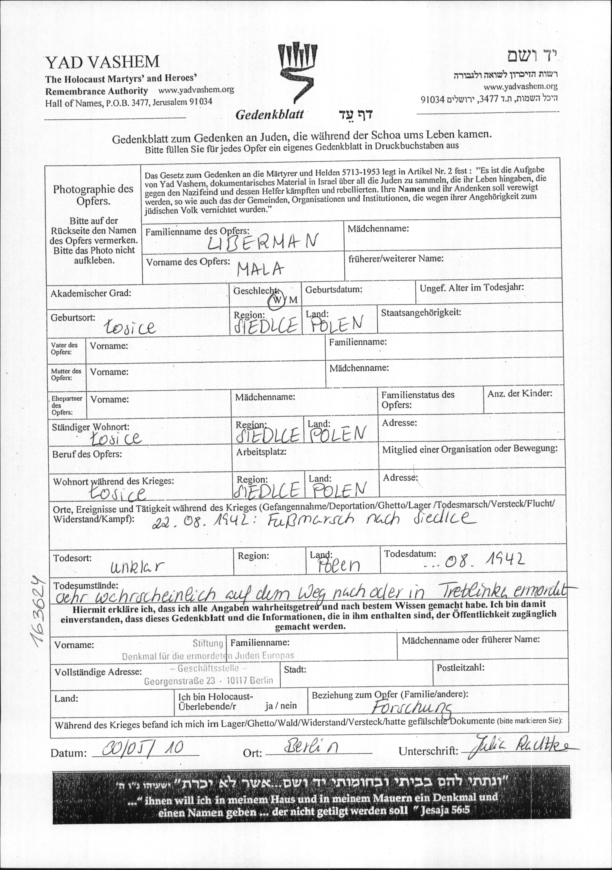 Mala Liberman was born in Losice, Poland. Prior to WWII she lived in Losice, Poland. During the war she was in Siedlce, Poland. Mala was murdered in the Shoah. Place of death: Lublin, Poland, 08/1942.