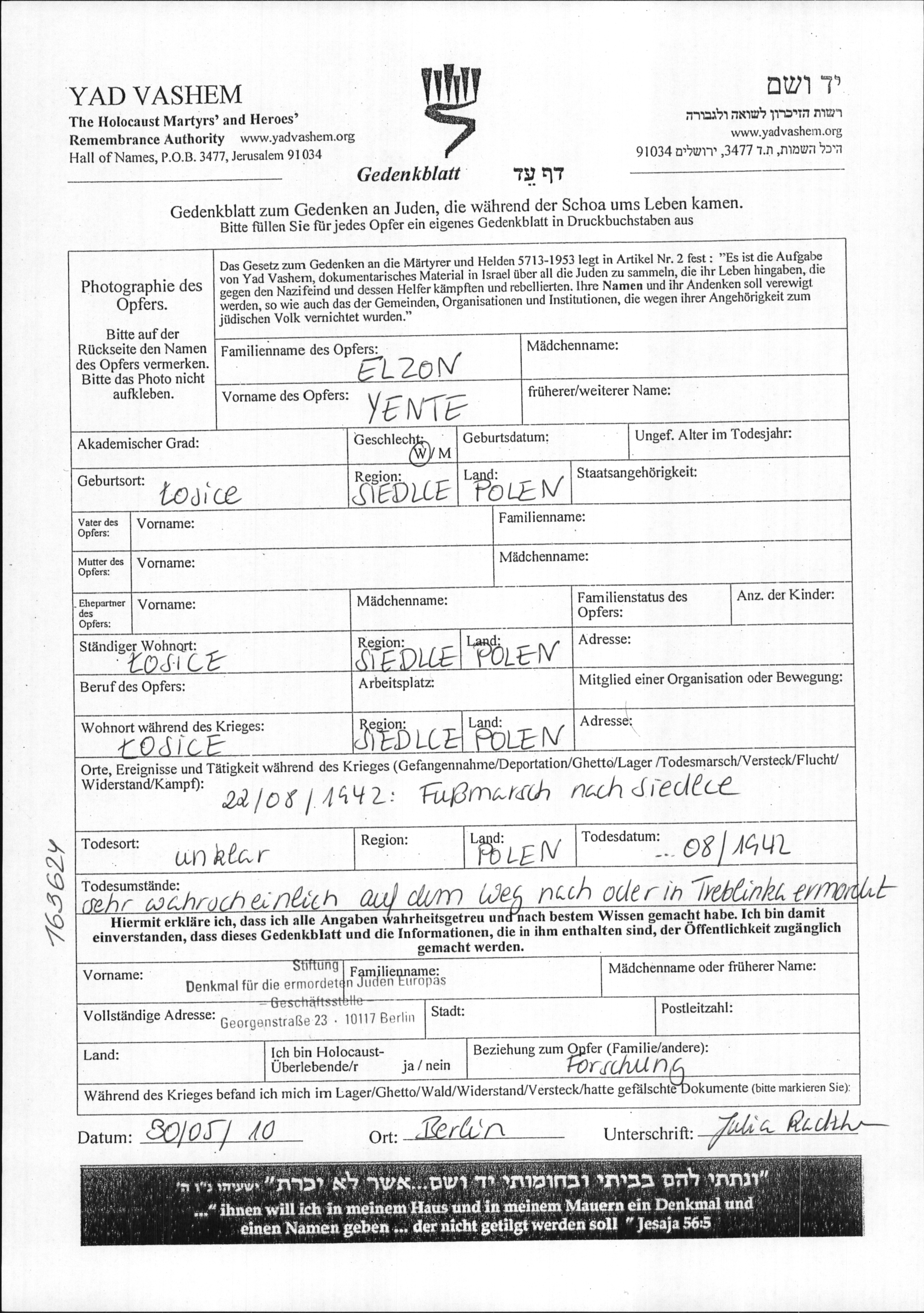 Yente Elzon was born in Losice, Poland. Prior to WWII she lived in Losice, Poland. During the war she was in Losice, Poland. Yente was murdered in the Shoah. Place of death: Poland, 08/1942.