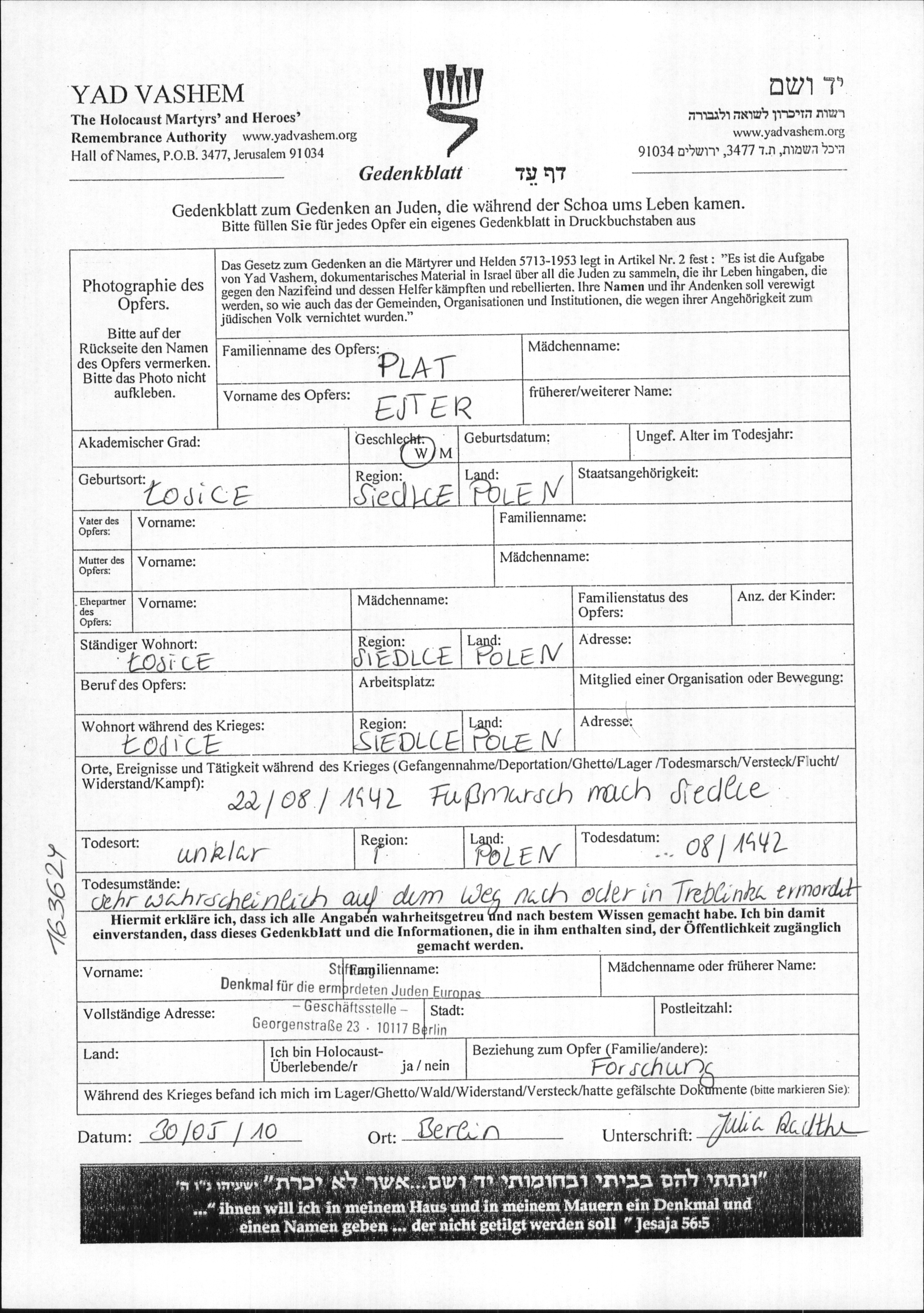 Ester Plat was born in Losice, Poland. Prior to WWII she lived in Losice, Poland. During the war she was in Losice, Poland. Ester was murdered in the Shoah. Place of death: Poland, 08/1942.